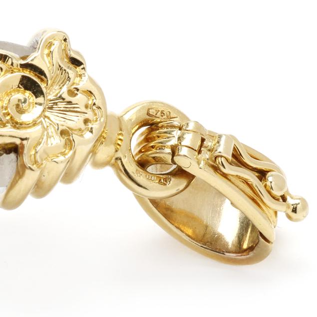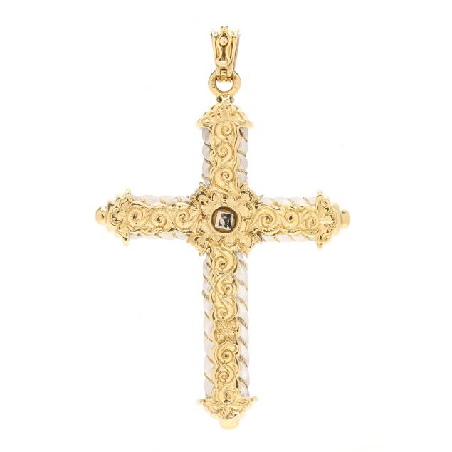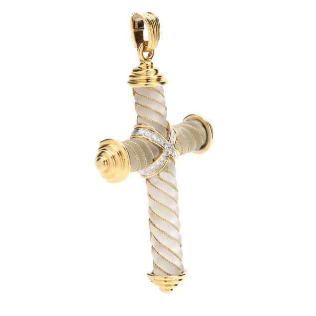 The carved rock crystal quartz cross embellished with gold rope twist accents, the center with bi-color gold X design bead set with full cut round diamonds weighing approximately .66 total carat (G-H color, VS2-SI1 clarity), with hinged tapered bail with figure eight safety, stamped 750 and with Italian registry mark 1581AL.