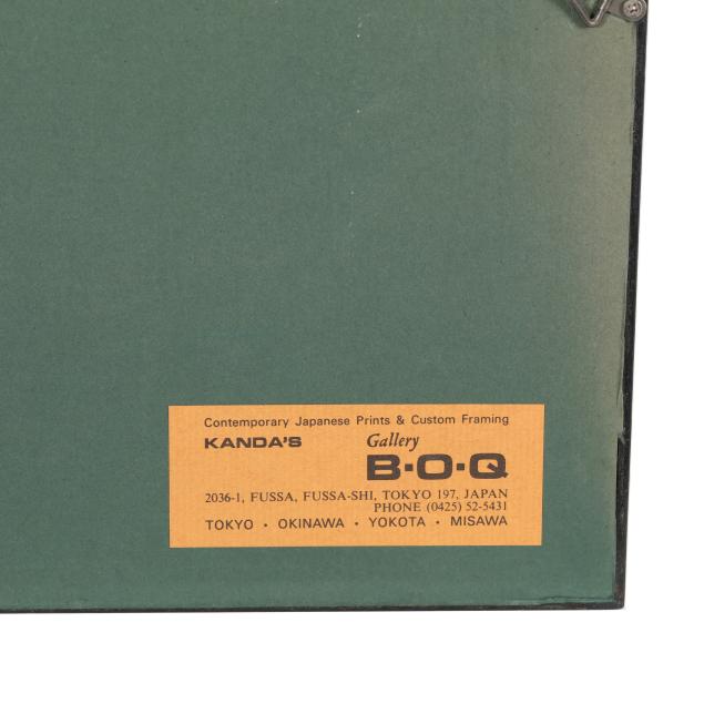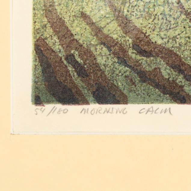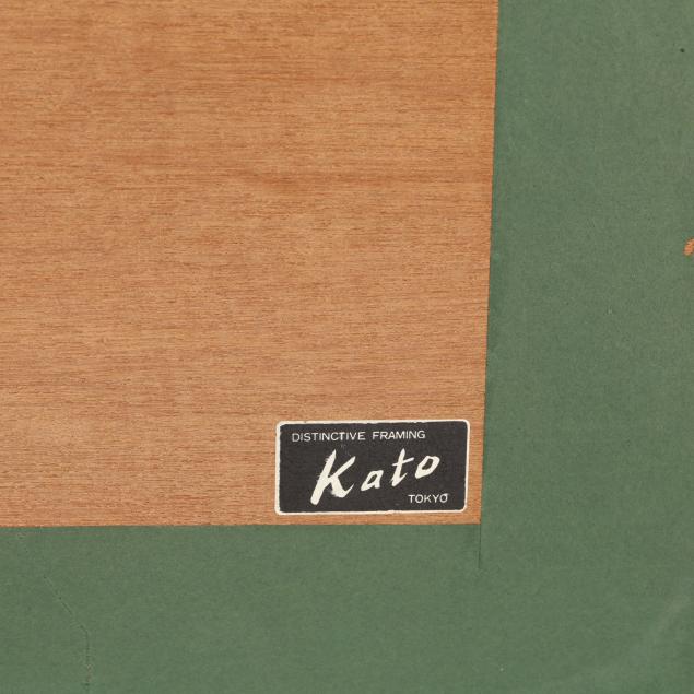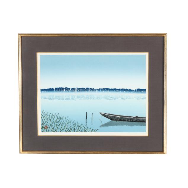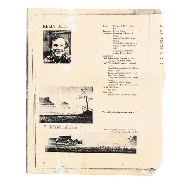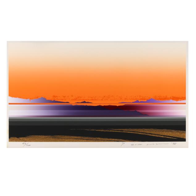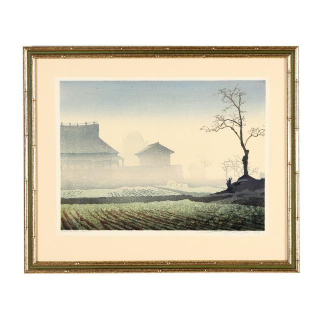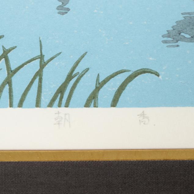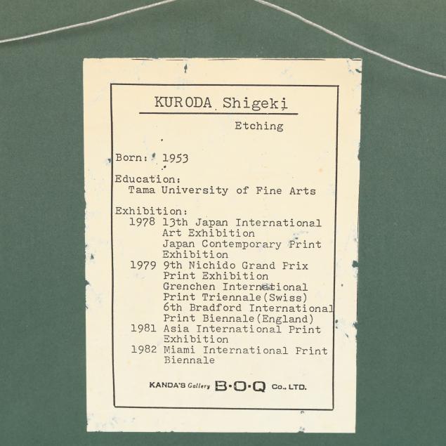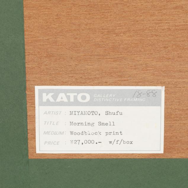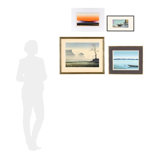 Includes an aquatint etching by Shigeki Kuroda (Japanese, b. 1953), Pale Square, pencil signed in lower margin 48/70, Pale Square, Shigeki Kuroda, framed in Japan by Kanda with mat under glass i black wood frame (Frame dimensions 9 1/4 x 16 1/2 x 1 in., Sight size 10 1/2 x 6 in.)(Very good condition; not examined outside of the frame), a color silkscreen by Tetsuro Sawada (Japanese, 1933-1998), edition 47/120 (Mat size 14 1/4 x 20 1/4, Sight size 8 1/2 x 14 1/2 in.)(presented loose but with top margin adhered to a mat; some areas of discoloration to lower left margin), a woodblock print by Daniel Kelly (b. 1947), Morning Calm, pencil signed to lower margin 54/180, Morning Calm, Daniel Kelly 83 (Frame dimensions 23 x 27 x 1 in., Sight size 15 1/2 x 21 in.)(Very good condition; some loose dirt/objects under the glass to upper center; not examined outside of the frame), and a woodblock print by Shufu Miyamoto (Japanese, b. 1950), Morning Smell, pencil signed in lower margin 114/150, Title in Japanese, Shufu Miyamoto '84, framed in Japan by Kato with gilt lined mat under glass in giltwood frame (Frame dimensions 17 x 20 3/4 x 1 in., Sight size 11 1/2 x 15 1/2 in.)(Very good condition; not examined outside of the frame).