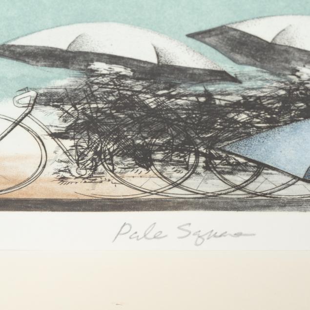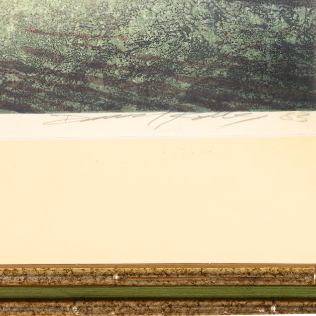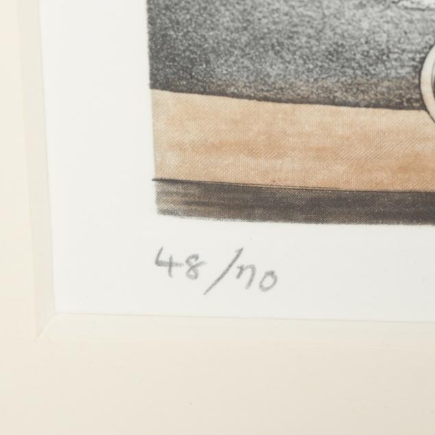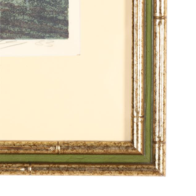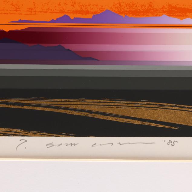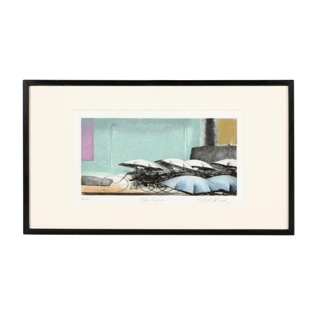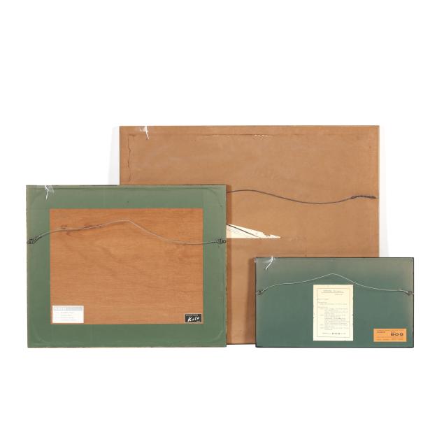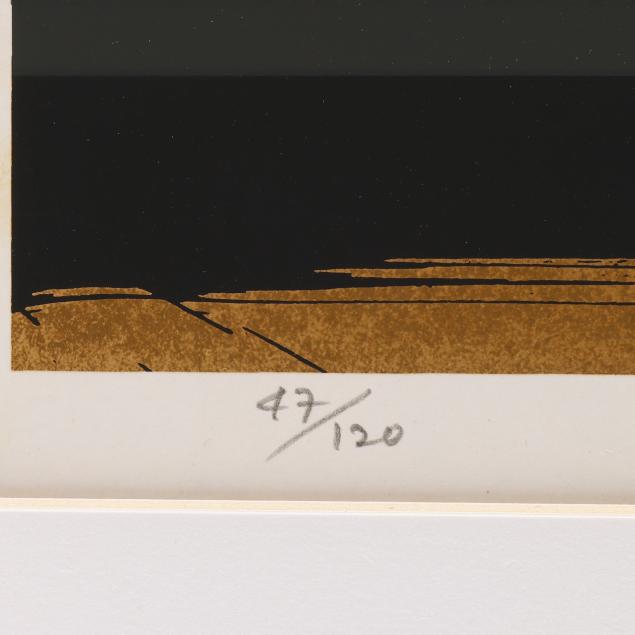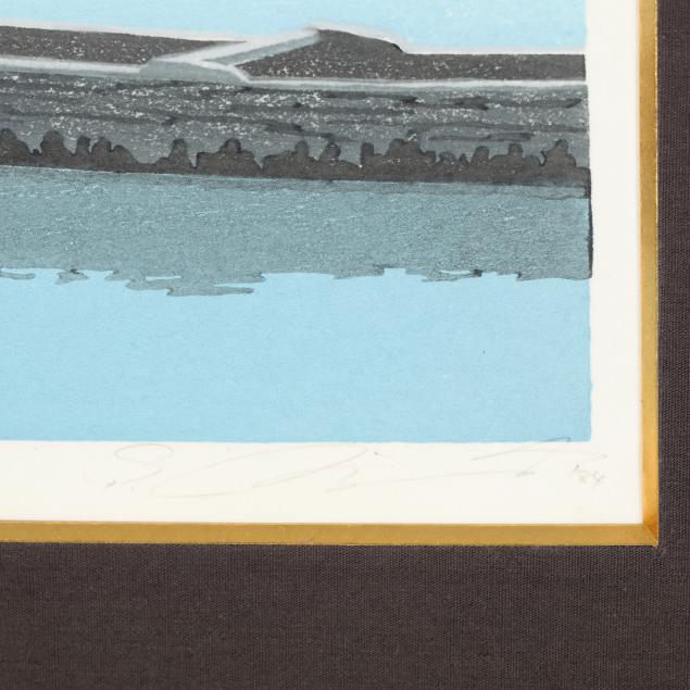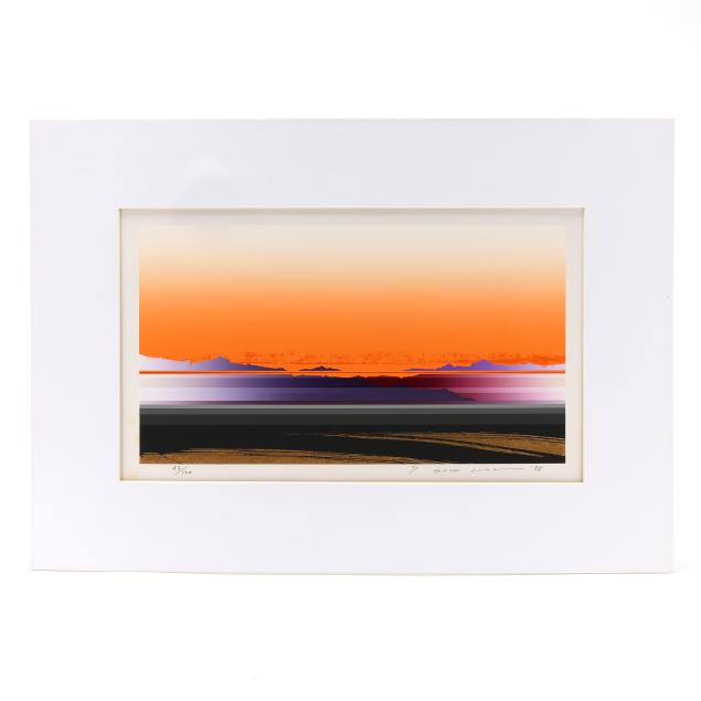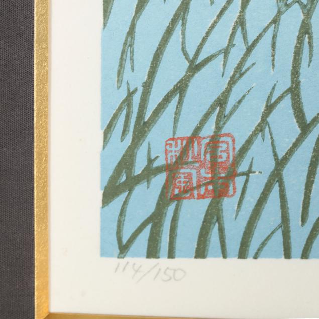 Includes an aquatint etching by Shigeki Kuroda (Japanese, b. 1953), Pale Square, pencil signed in lower margin 48/70, Pale Square, Shigeki Kuroda, framed in Japan by Kanda with mat under glass i black wood frame (Frame dimensions 9 1/4 x 16 1/2 x 1 in., Sight size 10 1/2 x 6 in.)(Very good condition; not examined outside of the frame), a color silkscreen by Tetsuro Sawada (Japanese, 1933-1998), edition 47/120 (Mat size 14 1/4 x 20 1/4, Sight size 8 1/2 x 14 1/2 in.)(presented loose but with top margin adhered to a mat; some areas of discoloration to lower left margin), a woodblock print by Daniel Kelly (b. 1947), Morning Calm, pencil signed to lower margin 54/180, Morning Calm, Daniel Kelly 83 (Frame dimensions 23 x 27 x 1 in., Sight size 15 1/2 x 21 in.)(Very good condition; some loose dirt/objects under the glass to upper center; not examined outside of the frame), and a woodblock print by Shufu Miyamoto (Japanese, b. 1950), Morning Smell, pencil signed in lower margin 114/150, Title in Japanese, Shufu Miyamoto '84, framed in Japan by Kato with gilt lined mat under glass in giltwood frame (Frame dimensions 17 x 20 3/4 x 1 in., Sight size 11 1/2 x 15 1/2 in.)(Very good condition; not examined outside of the frame).