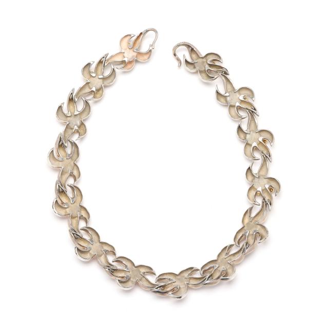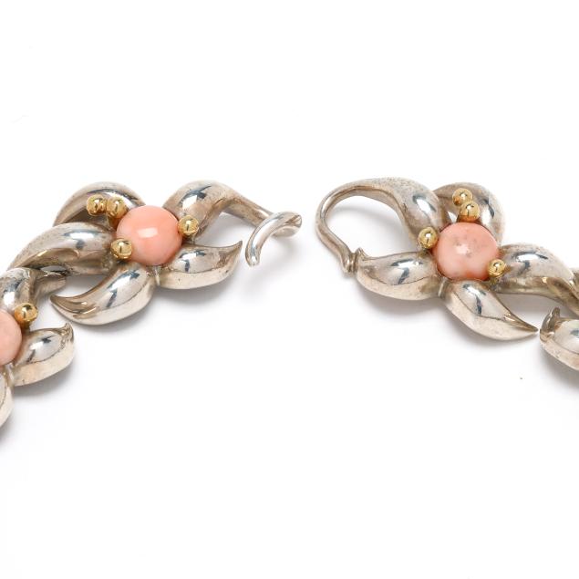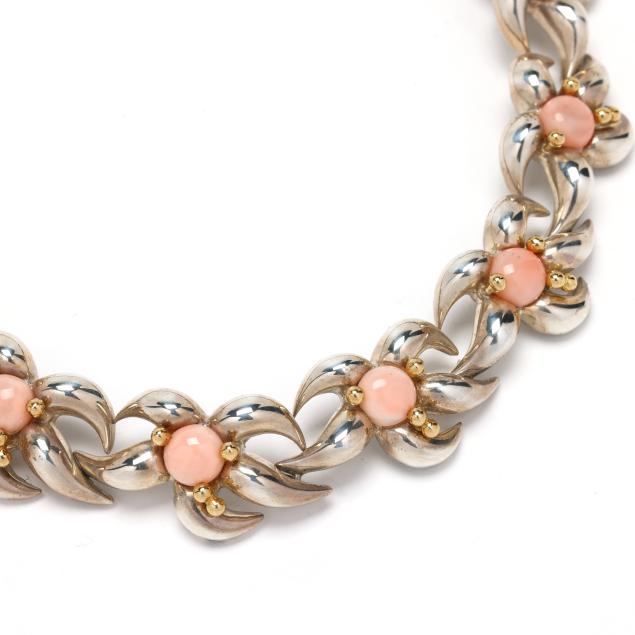 1993, from the Coral Reef series, the silver starfish link choker set with round cabochon cut coral (8mm) and with gold ball accents, completed with an integrated hook clasp, signed, dated, and stamped 925 750.