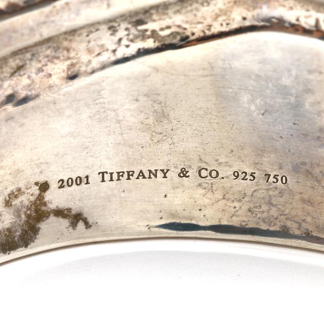 Circa 2001, from the Tiffany Nature collection, the wide silver cuff bracelet with engraved magnolia flower motif set with an applied gold ladybug, signed, dated, and stamped 925 750.