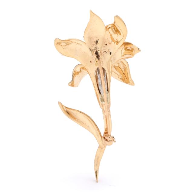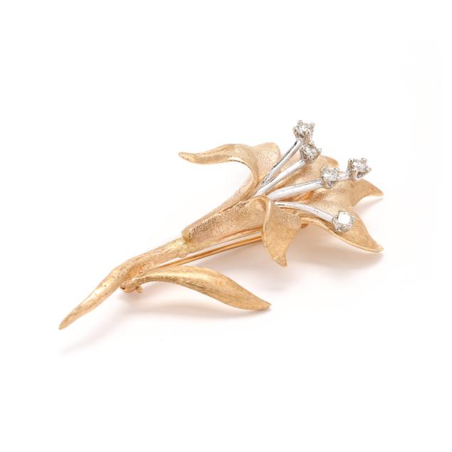 The yellow gold floral brooch with white gold stamen set to the tips with full cut round diamond melee, completed with a locking pin stem, testing 14KT.