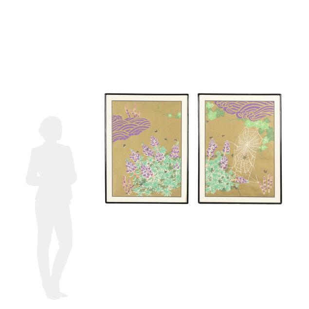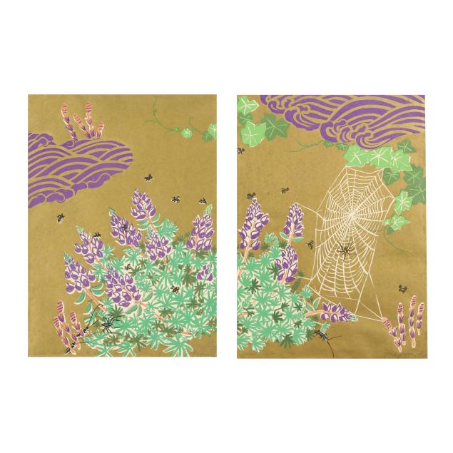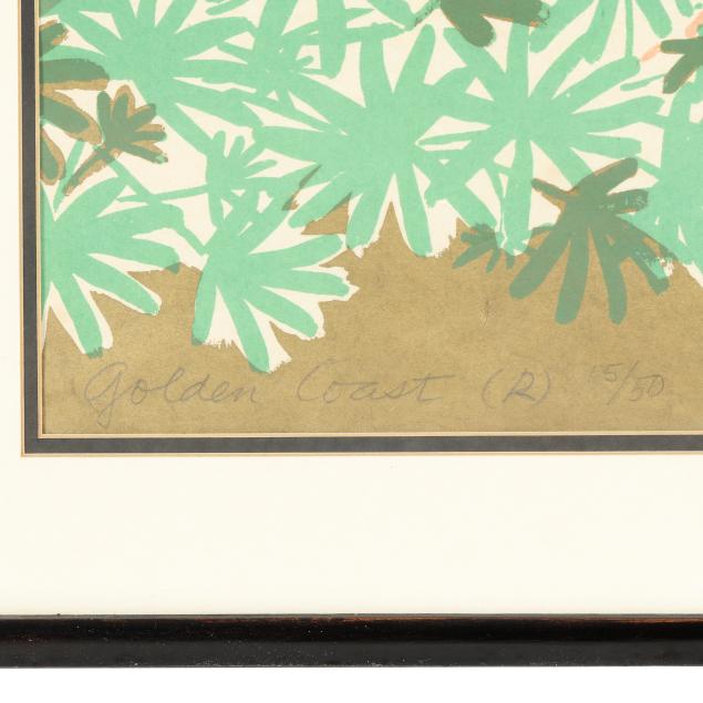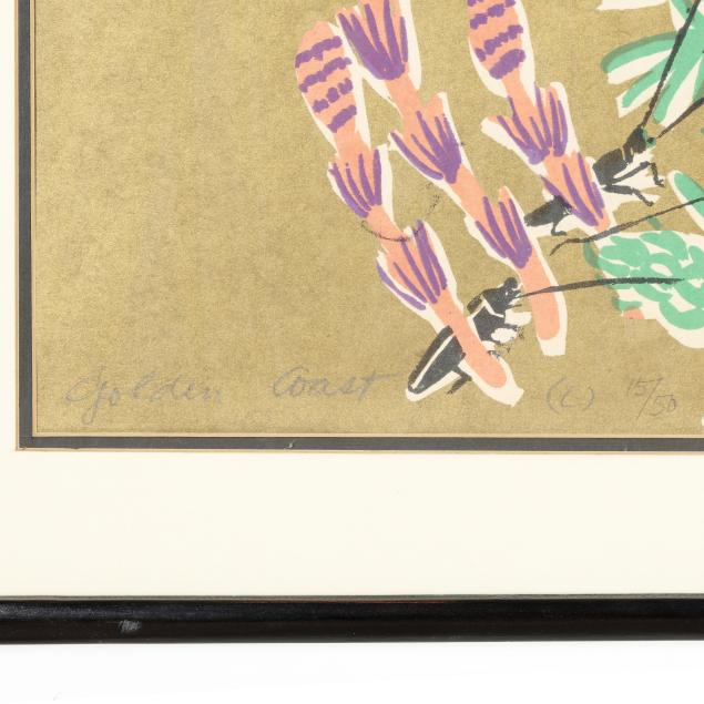 1989, a pair of silkscreen prints, from a small edition of 50, each signed to the lower edge of the image: Golden Coast, 15/50, and Mayumi with Japanese character, one has (L) for left and other with (R) for right, framed in Japan in identical manner with double mats under glass in black wood frames with rounded corners.