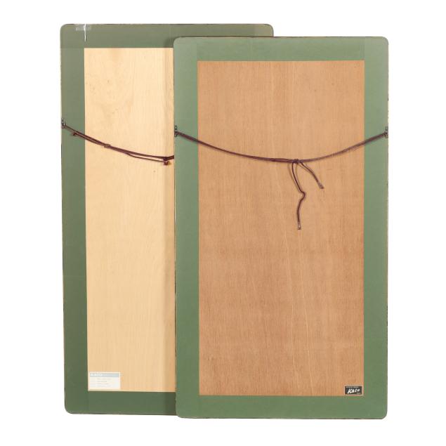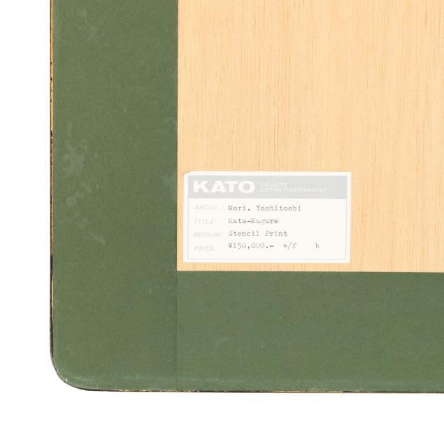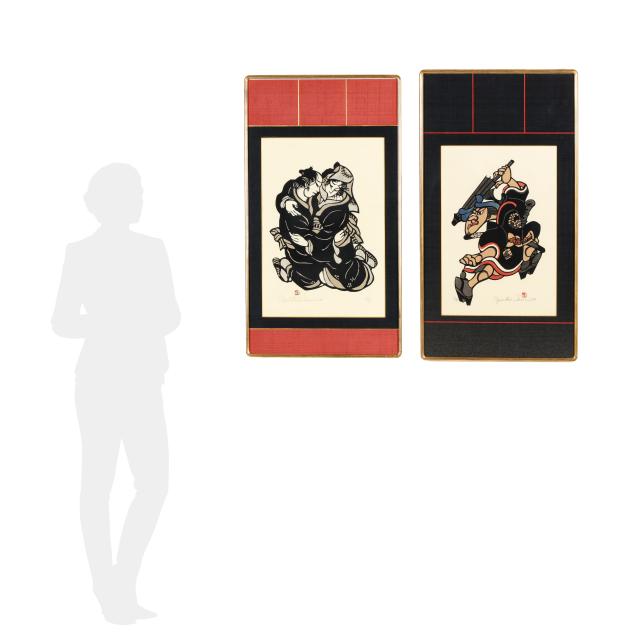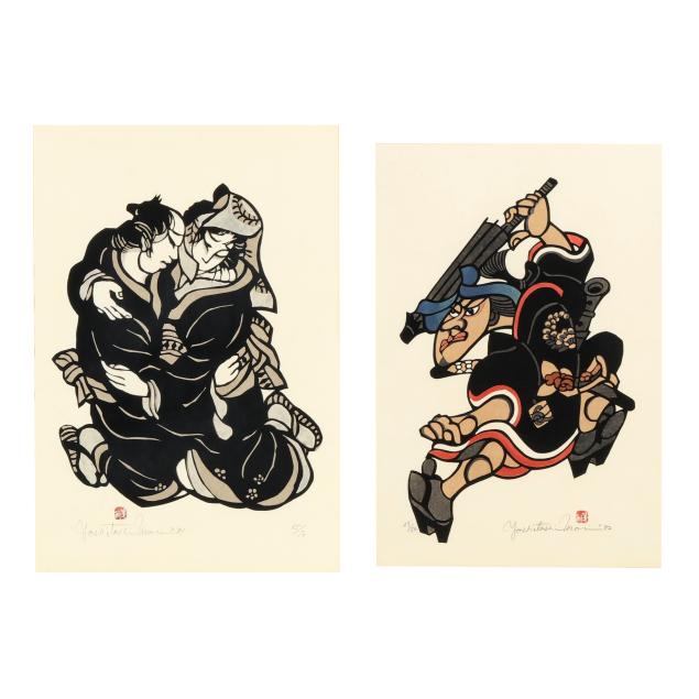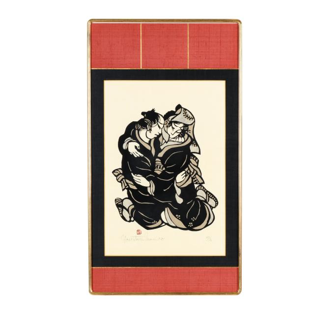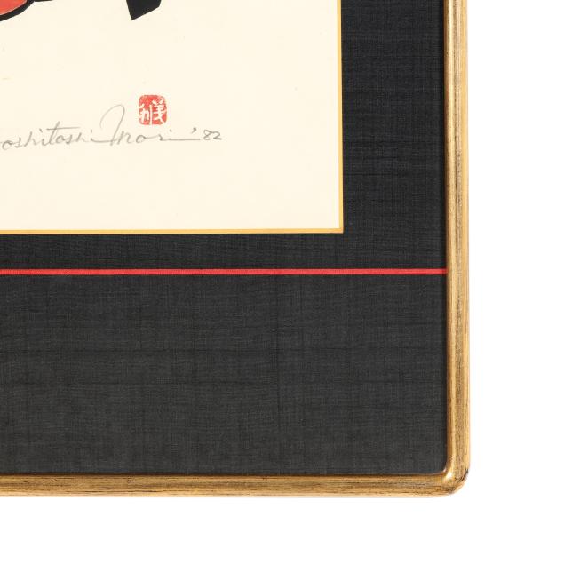 Includes two woodblock prints, the first of a man with an umbrella, signed in pencil 29/50, Yoshitoshi Mori '82 together with red seal in lower bottom (Frame dimensions 40 x 21 x 1 in., Sight size 23 x 15 1/2 in.)(overall even toning to paper; some light marks to top left corner), and the second of two figures embracing, signed in pencil Yoshitoshi Mori '81, 65/70, (Frame dimensions 38 1/2 x 21 1/2 x 1 in., Sight size 24 1/2 x 16 1/2 in.)(overall even toning to paper), both prints were beautifully framed in Japan by Kato with