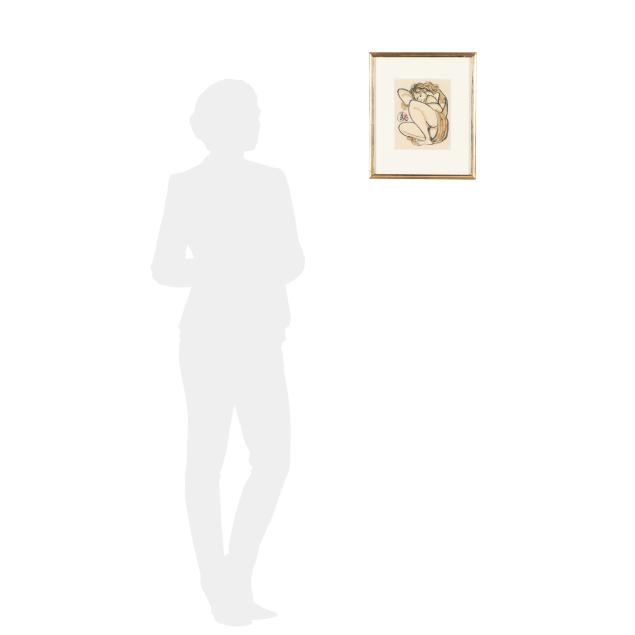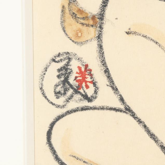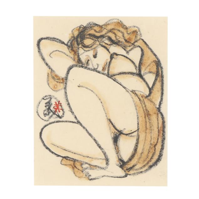 Charcoal on paper, image of a nude seated woman, signed by the artist together with red artist seal to image, reverse side of frame with artist signature in Japanese and English on rice paper, presented under glass framed in Japan by Kato with beveled mat in giltwood frame, presented together with a book on the artist.
