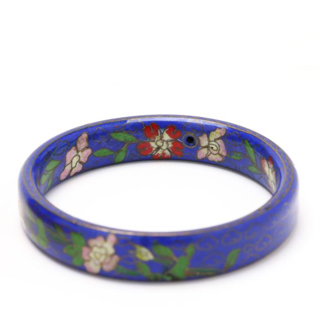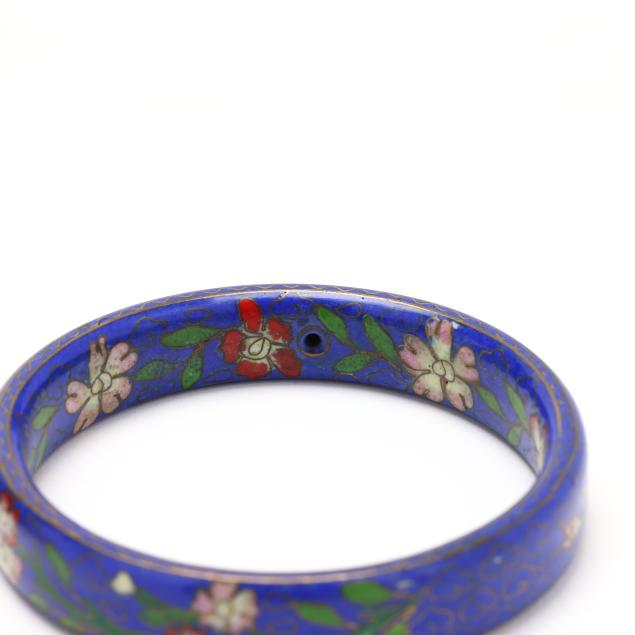 To include: a cloisonné bangle having a blue background with a cloud motif and floral details (.5 x 7.75 in. interior circumference); and a pair of carved cinnabar bangles with geometric motifs (5/8 x 8 in. interior circumference).