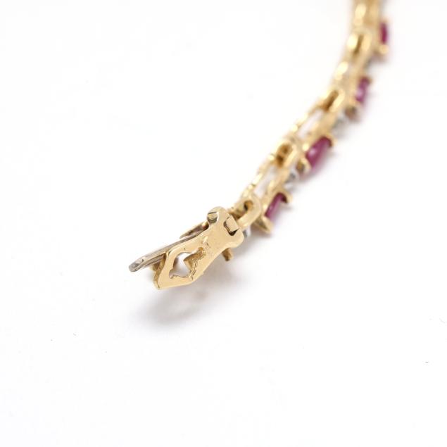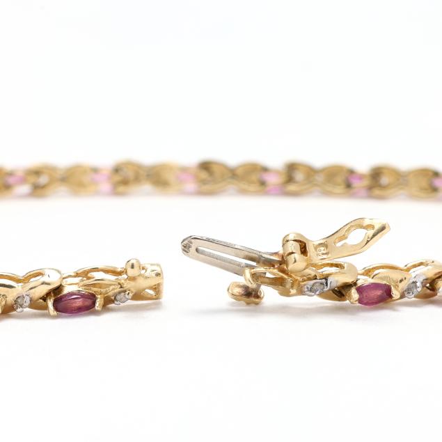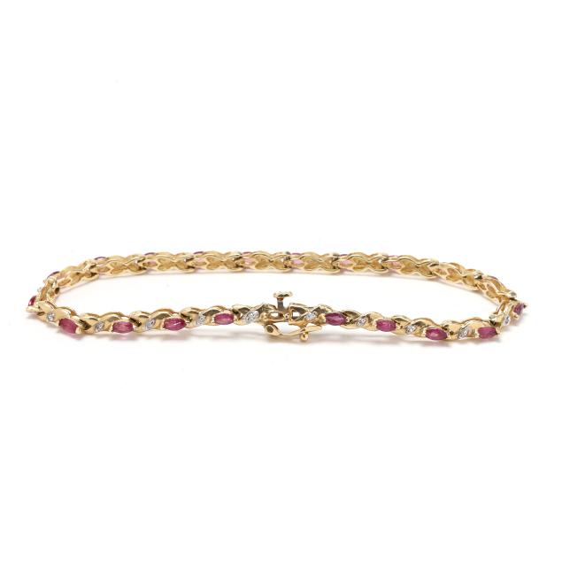 The gold bracelet set with marquise cut rubies weighing approximately 2.0 total carats and with 'X' links set with single cut diamond melee, completed with an integrated box clasp, stamped CI 14K.