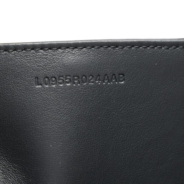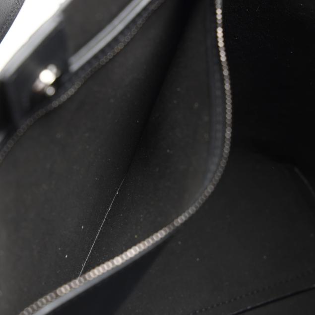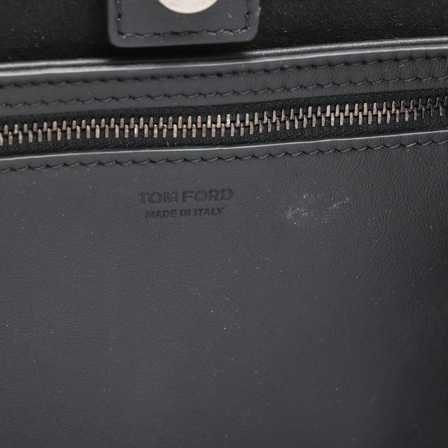 The exterior in gunmetal Burmese python with flat leather handles, the interior in black felt with single zipper pocket and snap closure, stamped made in Italy.