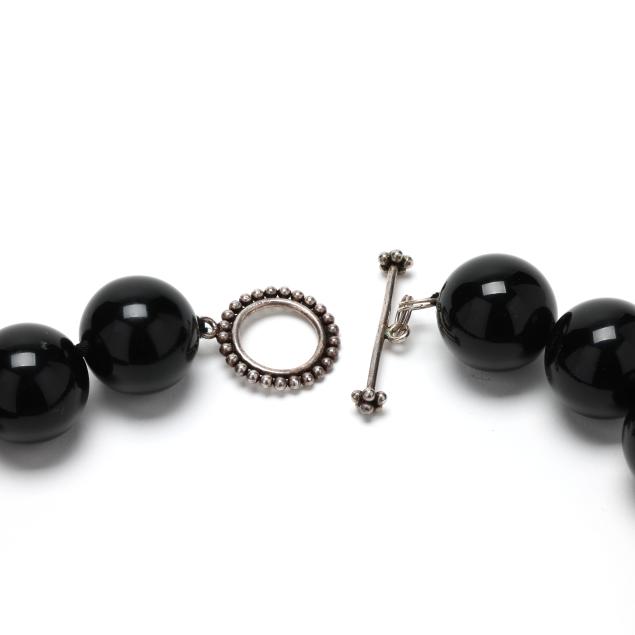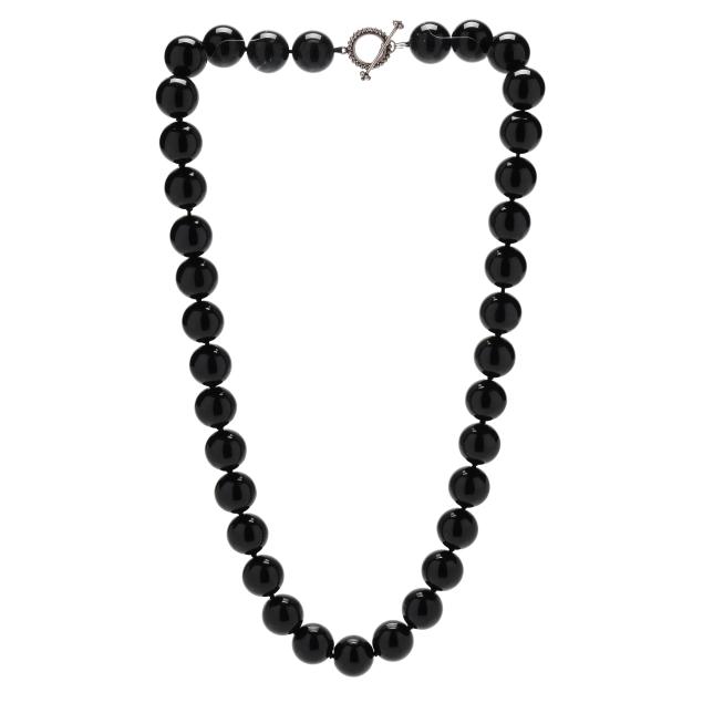 Strung knotted with (36) round black onyx beads (21.5mm to 22.0mm), completed with a toggle clasp testing silver.