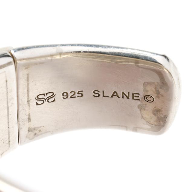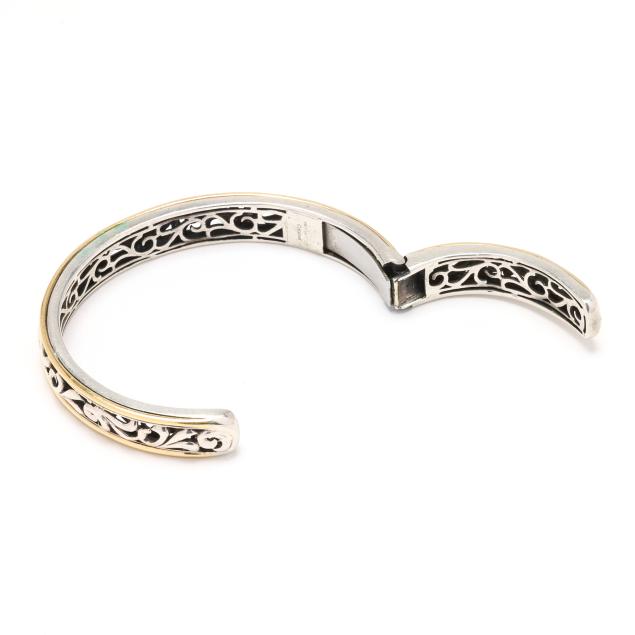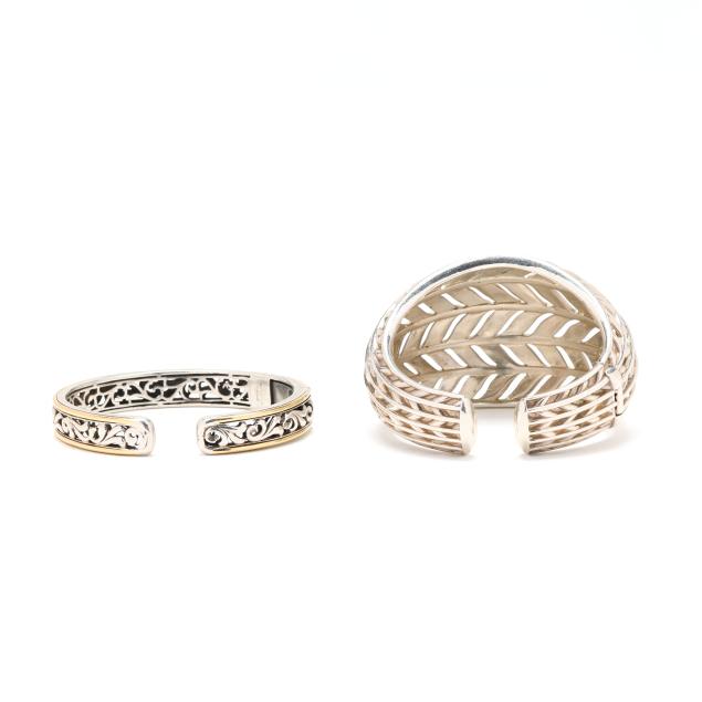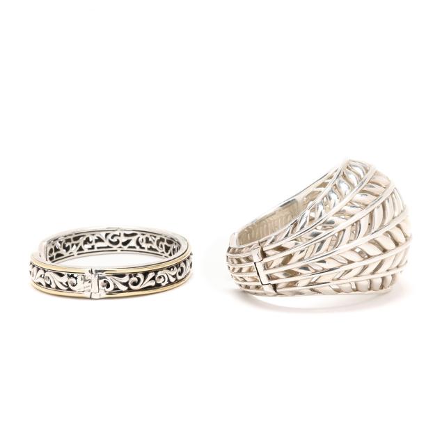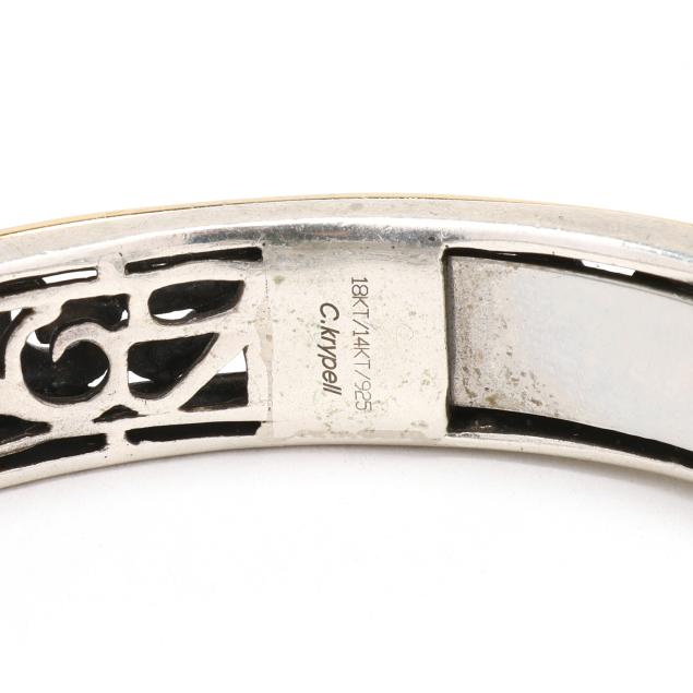 To include: a wide silver domed hinged cuff bracelet with foliate motif, signed Slane and stamped 925 (1 7/8 x 5.5 in. with .5 in. opening); and a hinged silver cuff bracelet with scroll design between gold accents, signed C. Krypell, stamped 18KT / 14KT / 925, XRF testing silver with gold plating (3/8 x 6 1/8 in. with .5 in. opening).