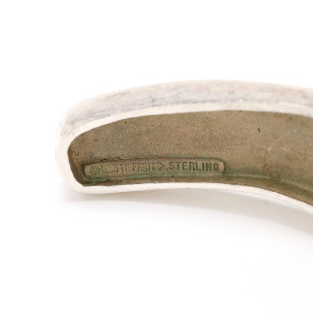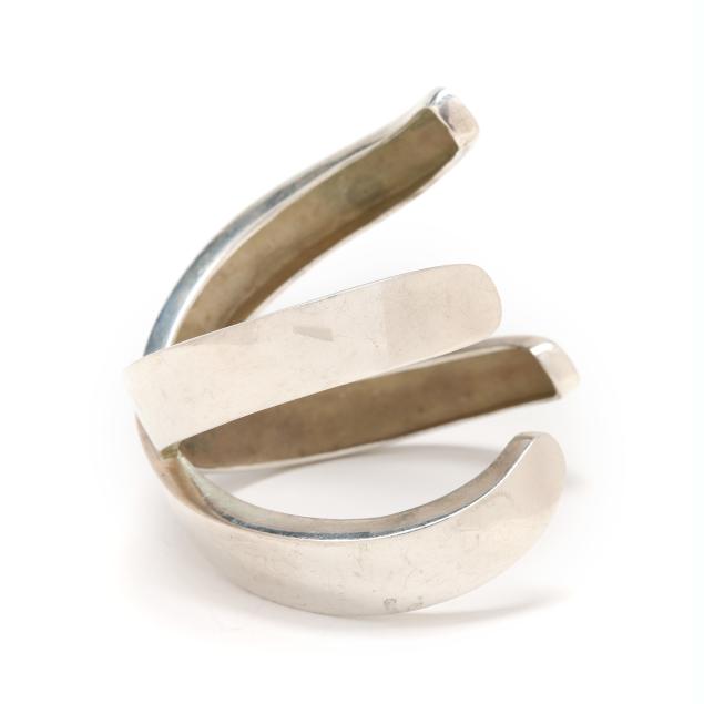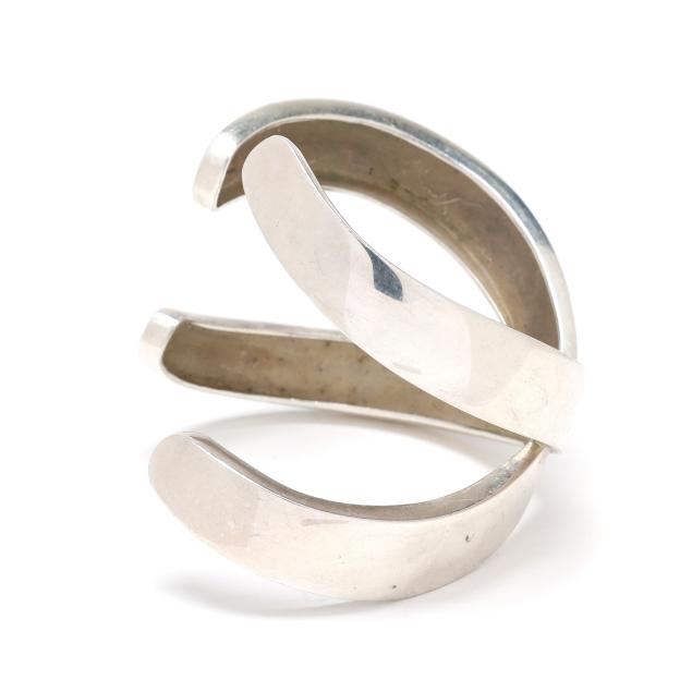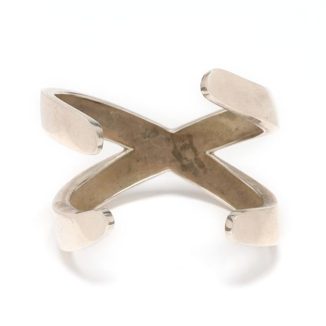 Circa 1995, the silver cuff bracelet in an 'X' motif, signed and stamped Sterling.