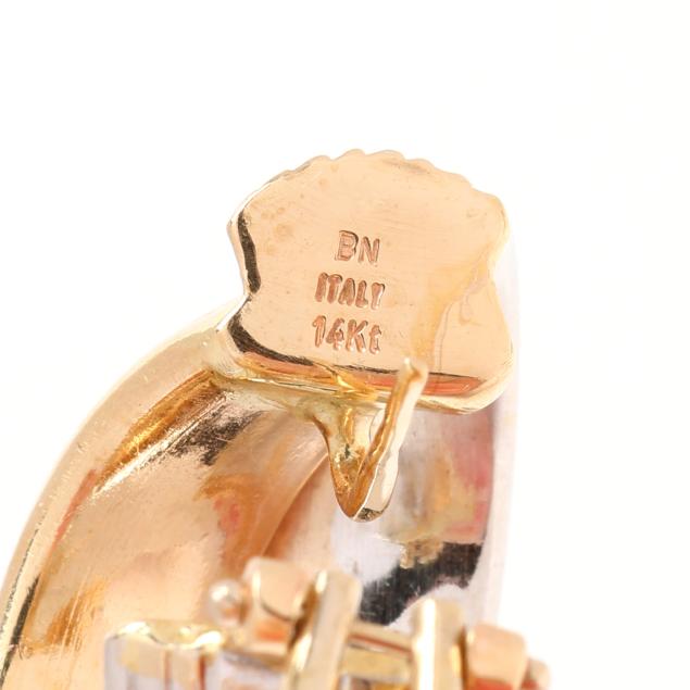 The fluted gold elements crossing at front, completed with posts and omega clip backs, stamped BN Italy 14Kt.