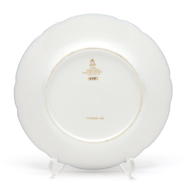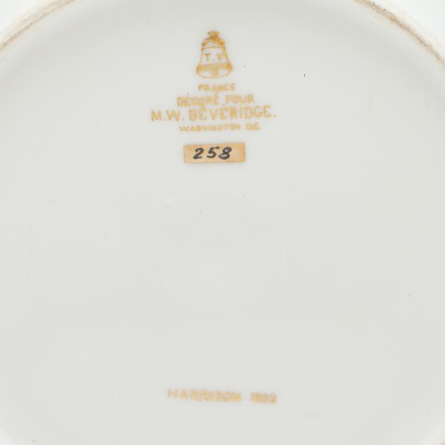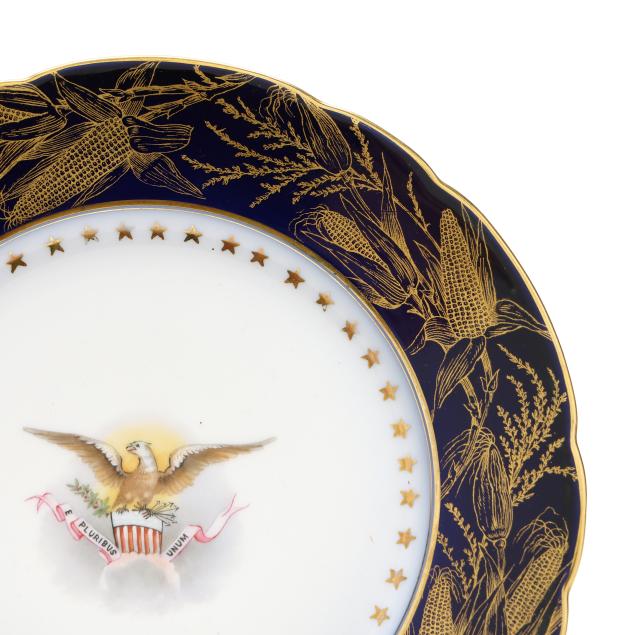 Made in France by Tressemanes & Vogt, hand-painted and gilt porcelain, each marked in gilt to the reverse "T.V. [within a bell]" and "FRANCE / DECORE POUR / M.W. BEVERIDGE / WASHINGTON, DC" along with "HARRISON 1892," featuring scalloped rims decorated in gilt corn and goldenrod tracery against a dark blue ground, the cavetto shot with 44 stars surrounding the Great Seal of the United States.