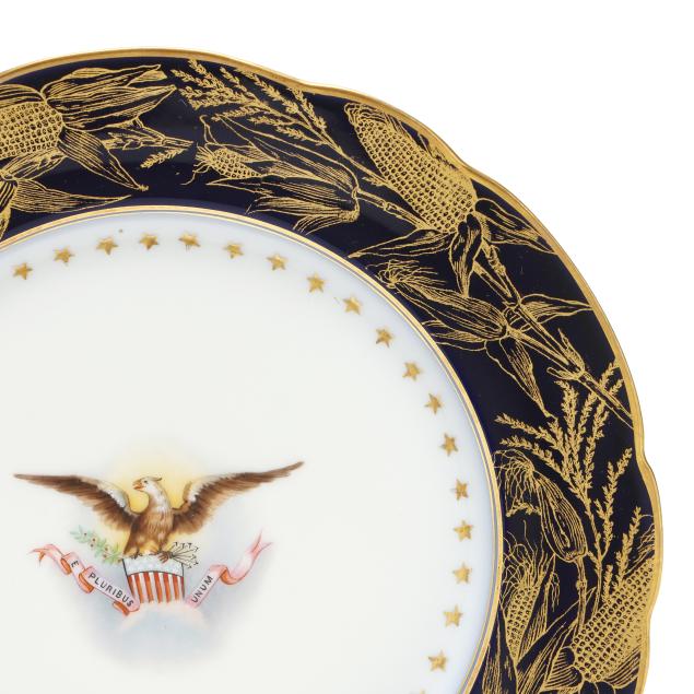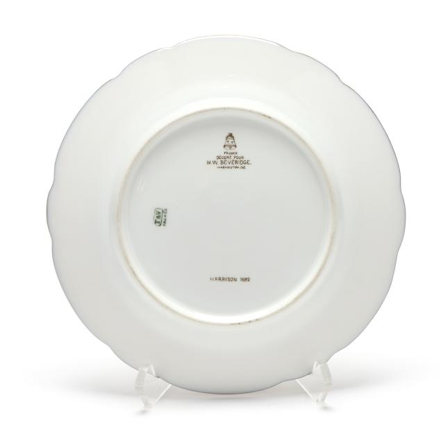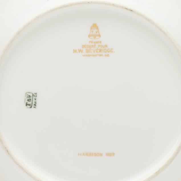 Made in France by Tressemanes & Vogt, hand-painted and gilt porcelain, each marked in gilt to the reverse "T.V." [within a bell] and "FRANCE / DECORE POUR / M.W. BEVERIDGE / WASHINGTON, DC" along with "HARRISON 1892" and "T&V [within a rectangle] / FRANCE" green mark, featuring scalloped rims decorated in gilt corn and goldenrod tracery against a dark blue ground, the cavetto shot with 44 stars surrounding the Great Seal of the United States.
