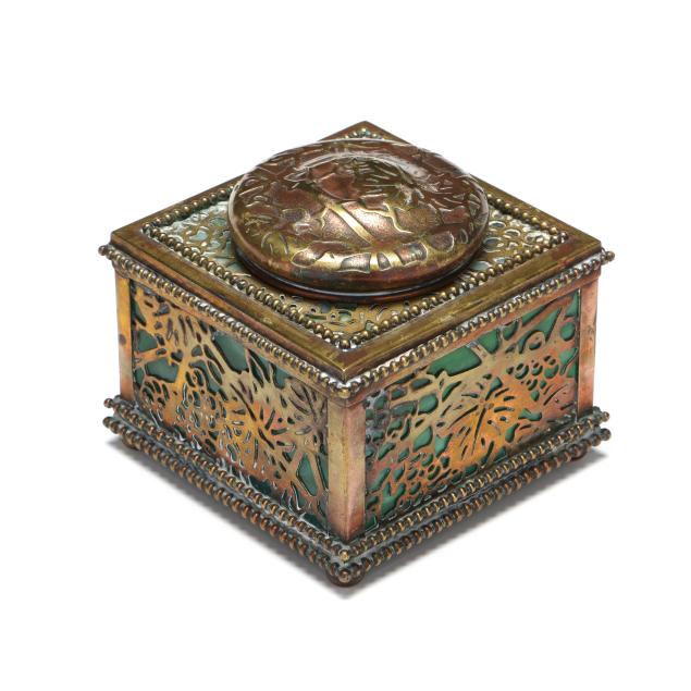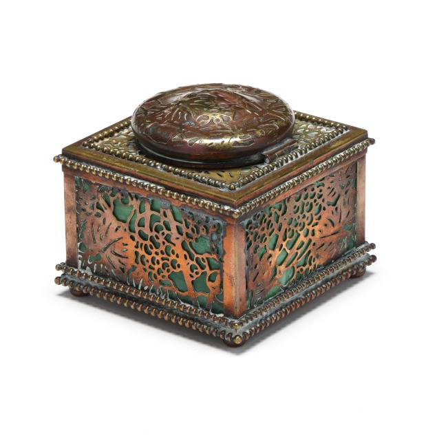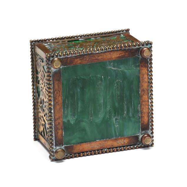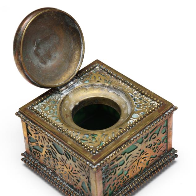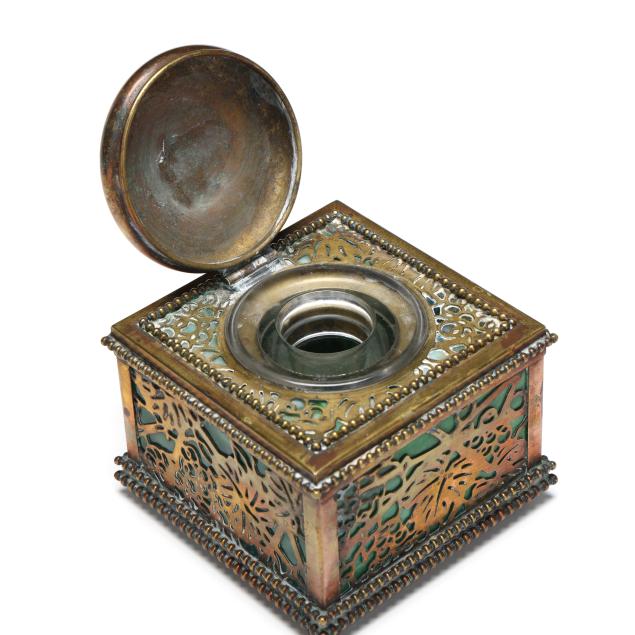 New York, circa 1910, etched and gilt bronze with green slag glass panels, larger cubic form model 844, impressed "TIFFANY STUDIOS / NEW YORK / 844" to the underside, includes fitted glass inkwell insert.