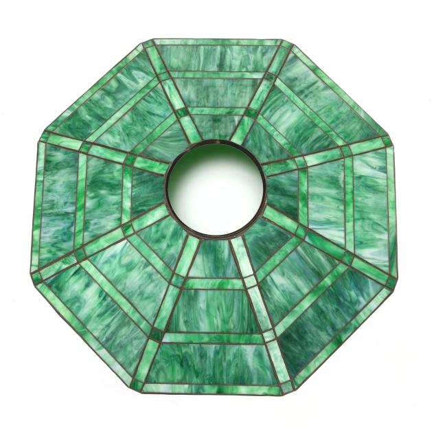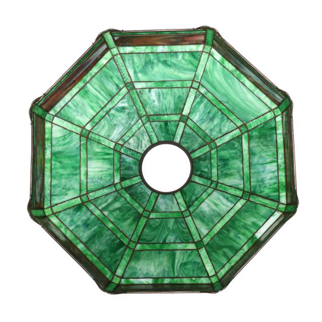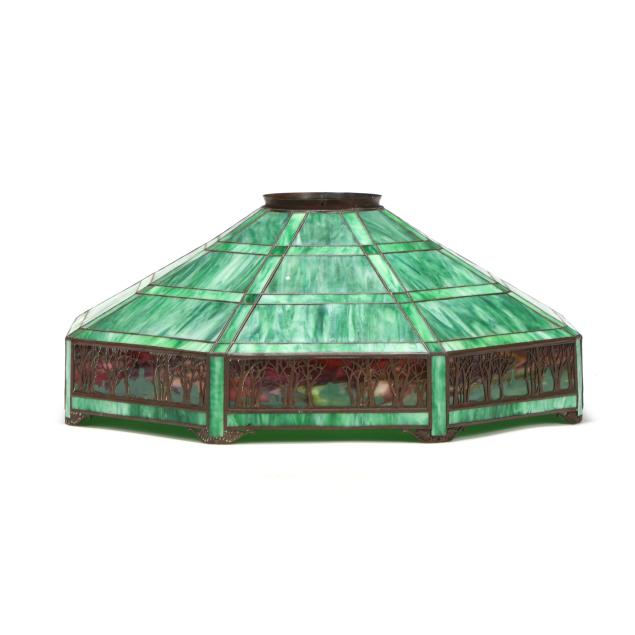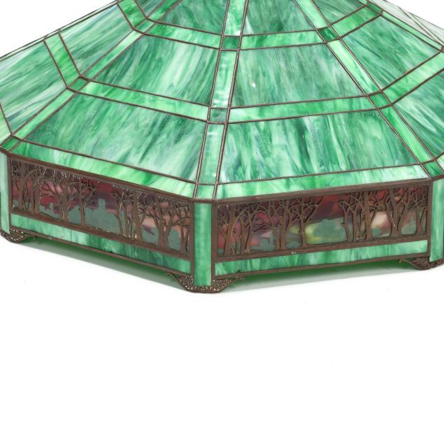 Meriden, Connecticut, circa 1915, eight-sided slag glass shade in tapering geometric panels, featuring a painted landscape frieze beneath patinated metal tree overlay, lower decorative scrolled motif border, with round upper rim, signed "HANDEL" to the interior came.