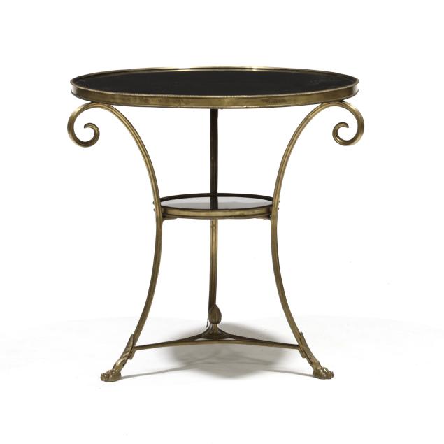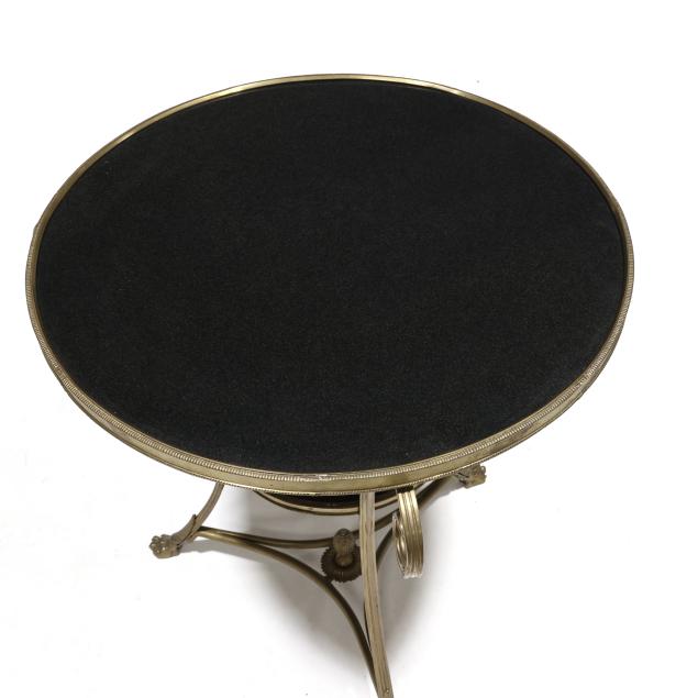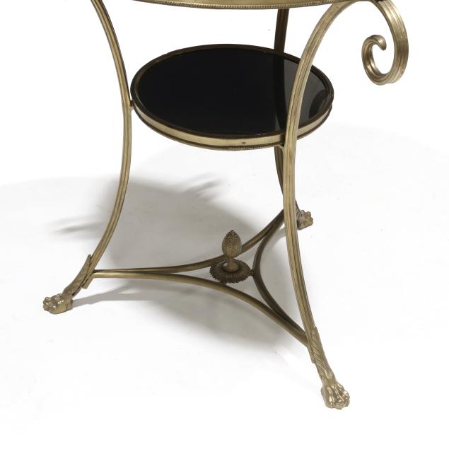 Late 20th century, black stone top, lower shelf, tripod base with paw feet.