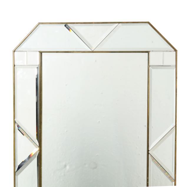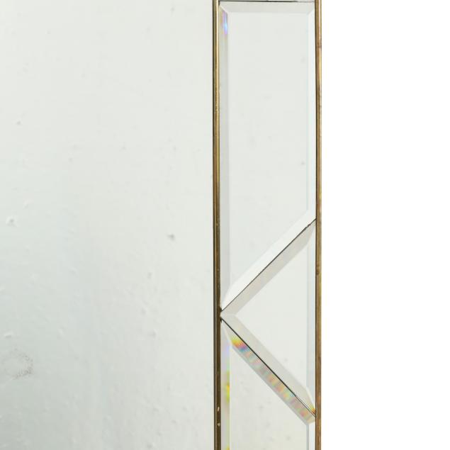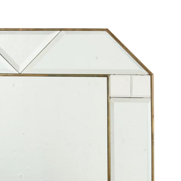 Late 20th century, rectangular central mirror with shaped beveled mirror surround, in a thin brass trim frame, labeled.