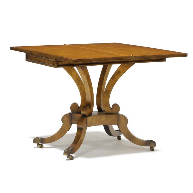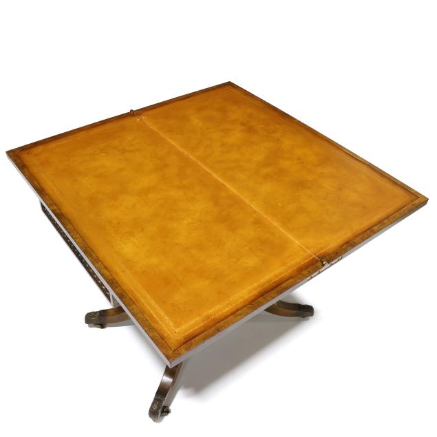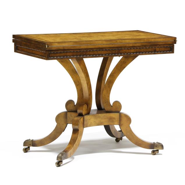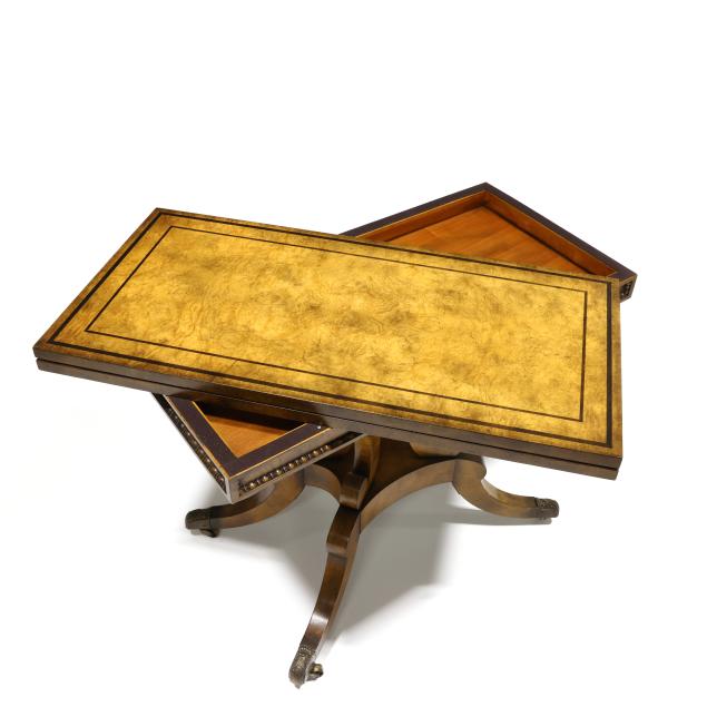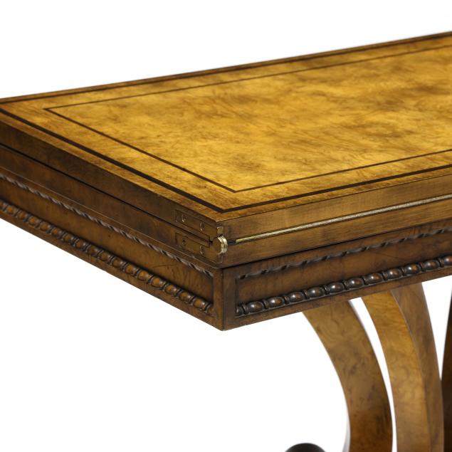 Late 20th century, high grade book-matched burl wood veneers with rosewood inlay, hinged swivel top with finished storage compartment, tan leather playing surface, paneled apron with beaded trim, quadruped base on brass capped feet and casters, labeled.
