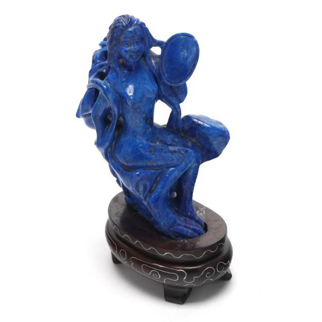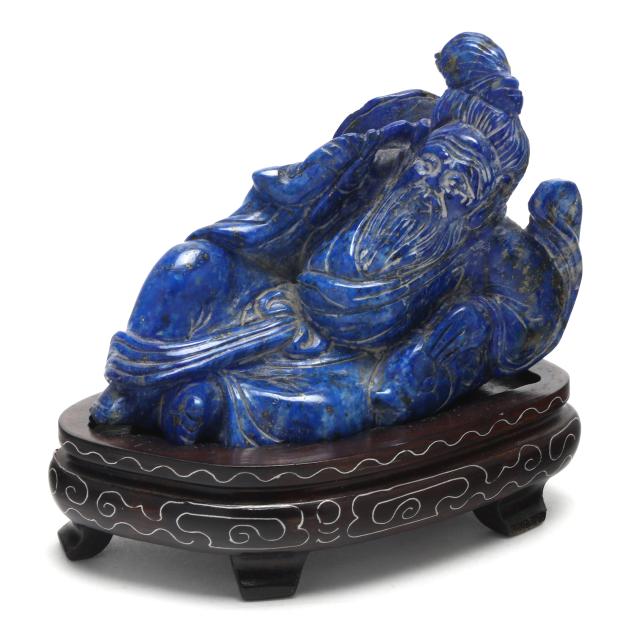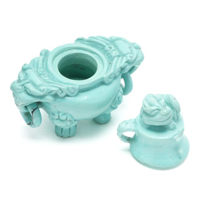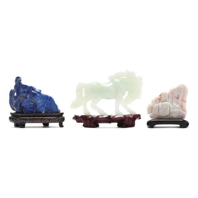 Private Collection, Southern Pines, North Carolina Horse carving with a few nicks; opaline carving with break and repair; turquoise censer with losses to two handles and a few small chips to lid; both lapis lazuli figures with a few nicks.