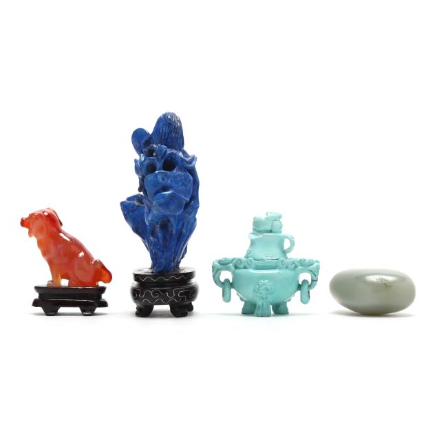 Late 19th or early 20th century, includes a celadon jade horse with stand (4 x 5 1/8 x 1 1/2 in.), an opaline birds and flowers among rockwork background with stand (not secured) (3 x 3 x 2 in.), a carnelian dog with stand (2 3/8 x 1 x 2 in.), a turquoise censer (2 3/8 x 2 5/8 x 1 3/4 in.), and two carved lapis lazuli figures with stands (woman 4 3/4 x 2 x 2 3/4 in.; reclining man 3 5/8 x 4 x 4 in.)
