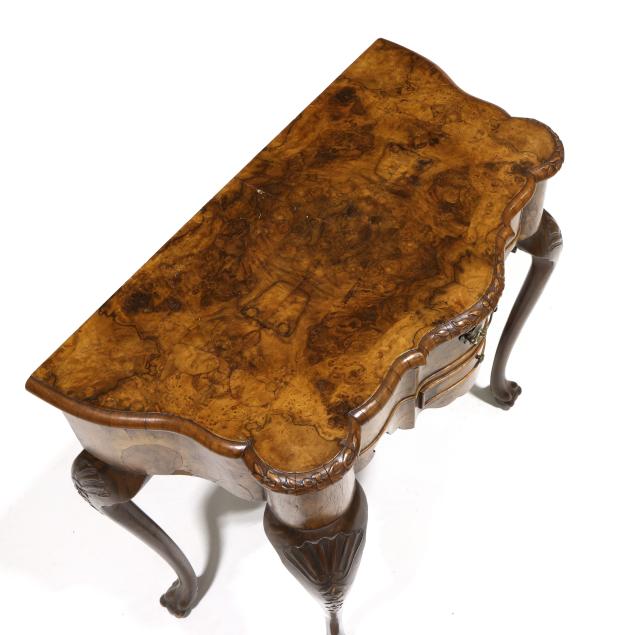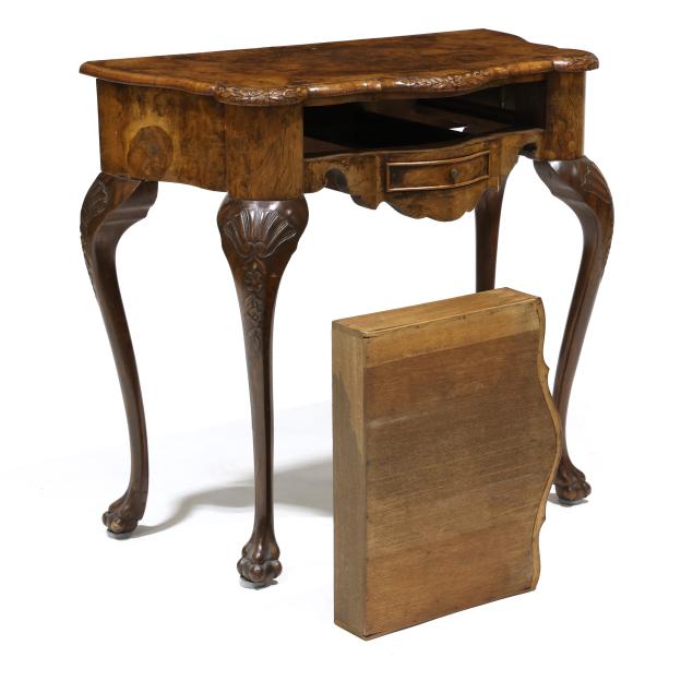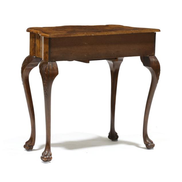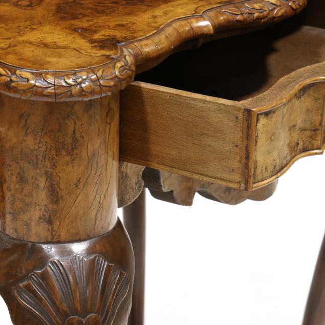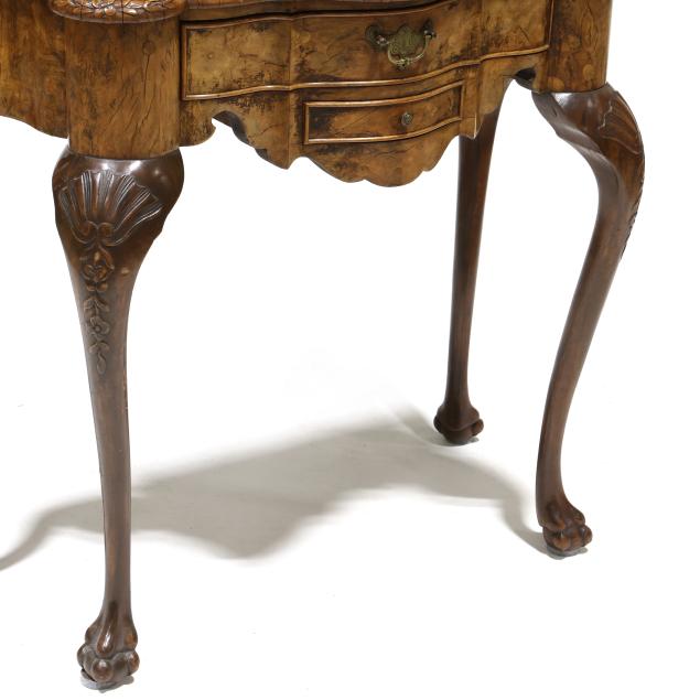 20th century, constructed from older woods, shaped top with relief carved floral edge, conforming cock beaded drawer over a smaller drawer, scalloped skirt, cabriole legs with shell carved knee on ball and claw feet.