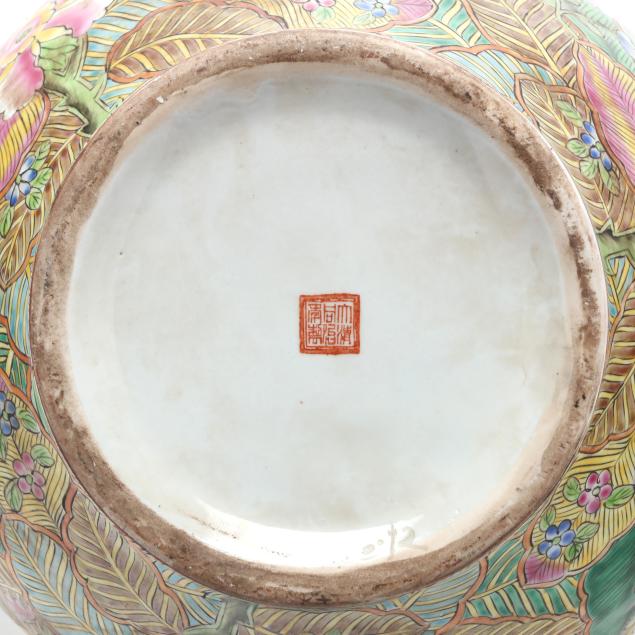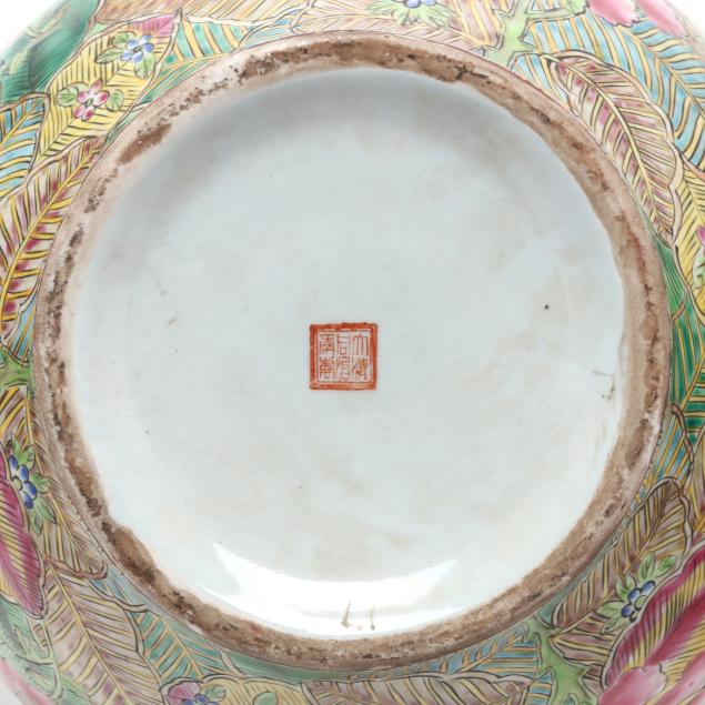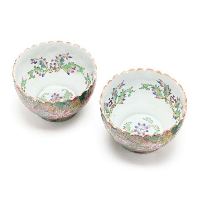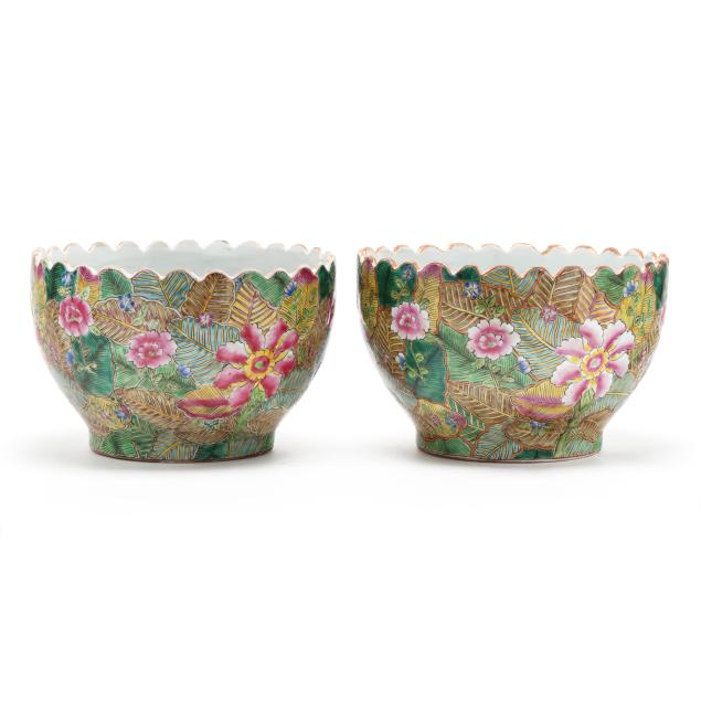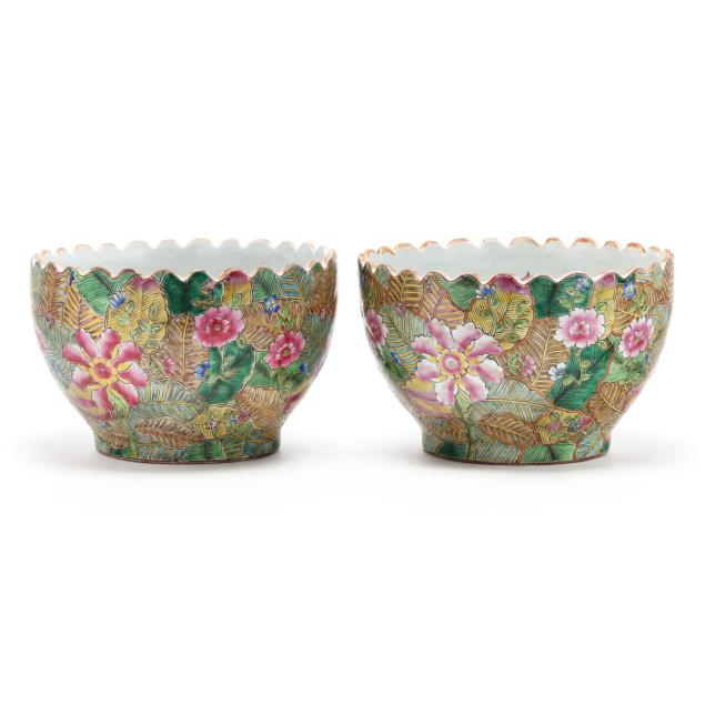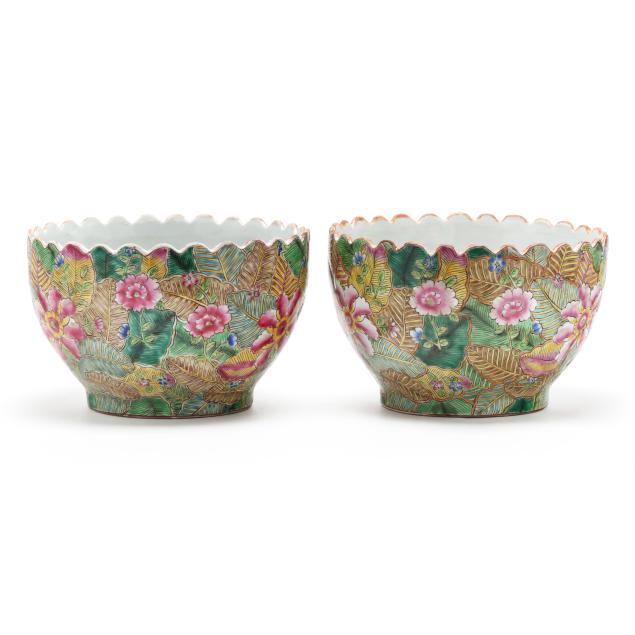 Mid to late 20th century, scalloped rim porcelain bowls hand painted with a myriad of blooming flowers in bright famille rose palette, the interior of each with garlands of flowers, the underside of each with red six character seal.