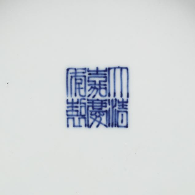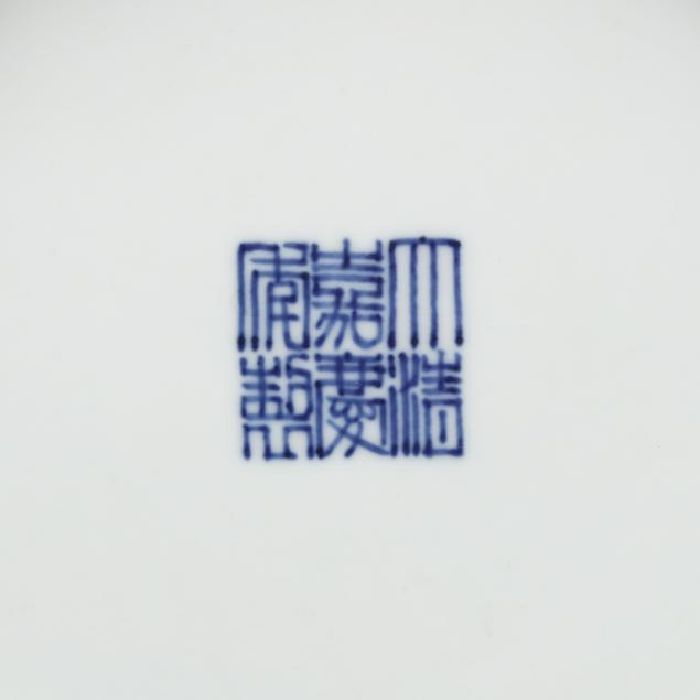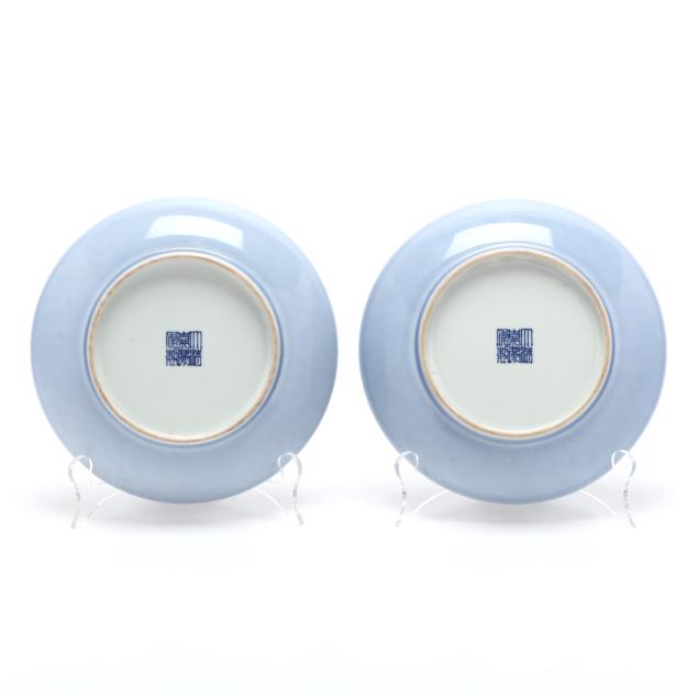 20th century, porcelain with lavender blue hue monochrome glaze, white to underside of each with an apocryphal Jiaqing seal mark in underglaze blue.