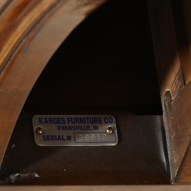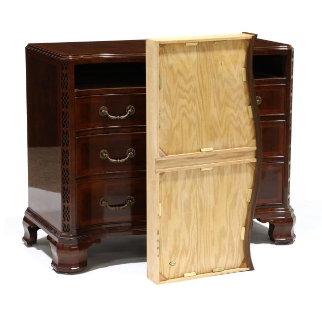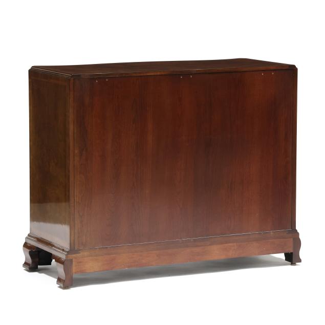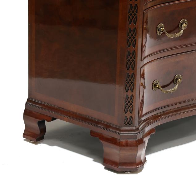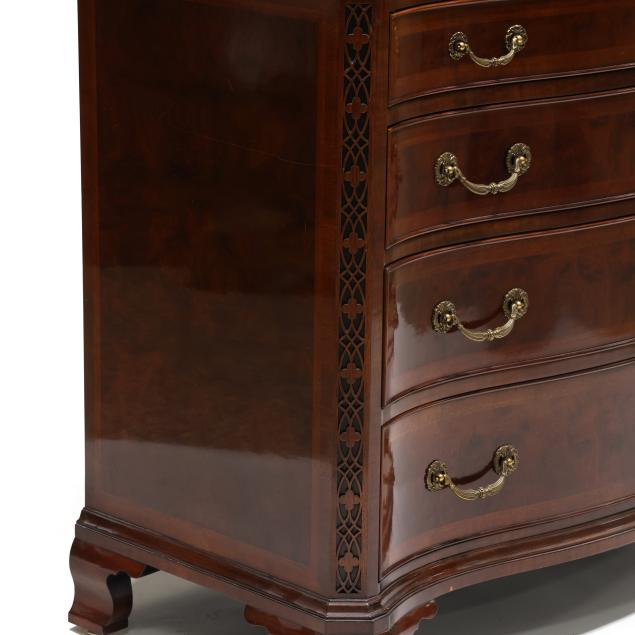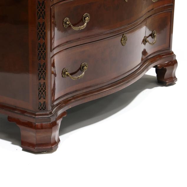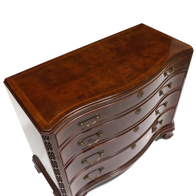 Late 20th century, serpentine form, four graduated cock beaded drawers with banded inlay, fretwork stiles, ogee bracket feet, labeled.