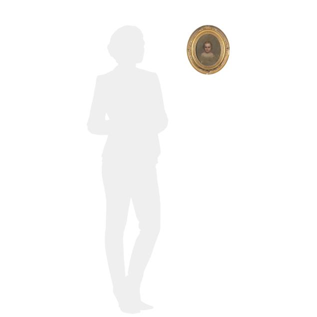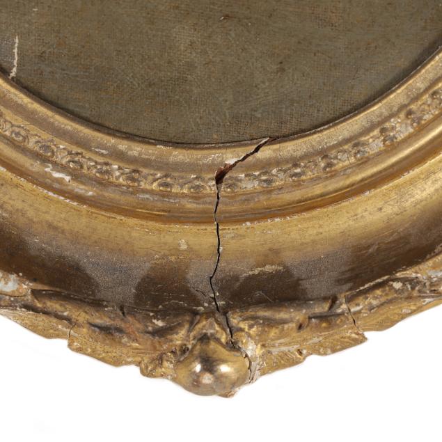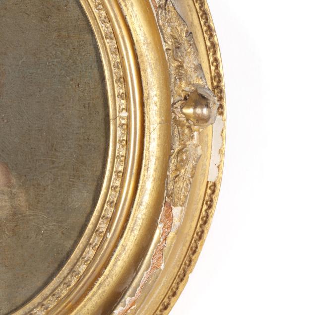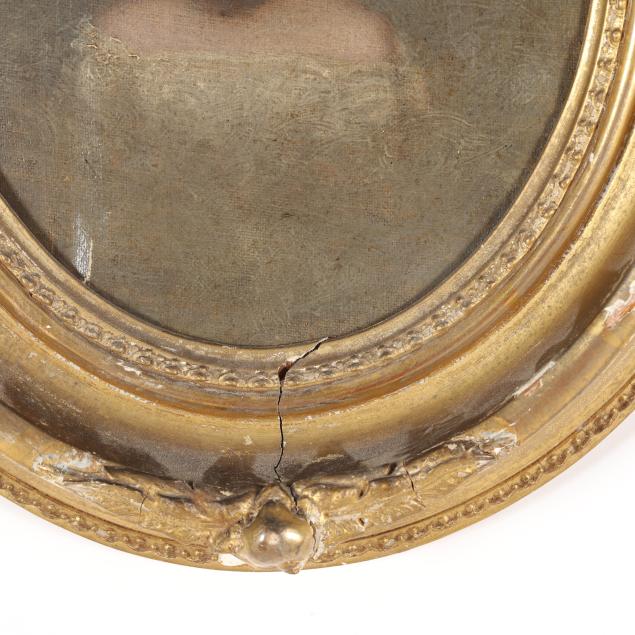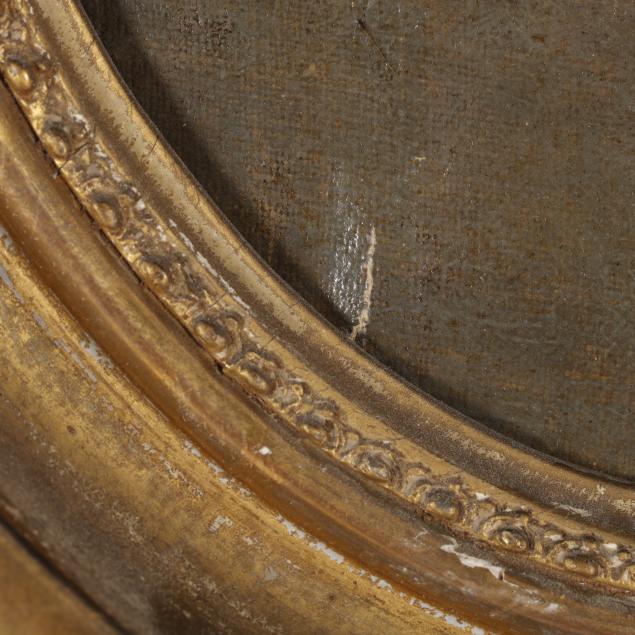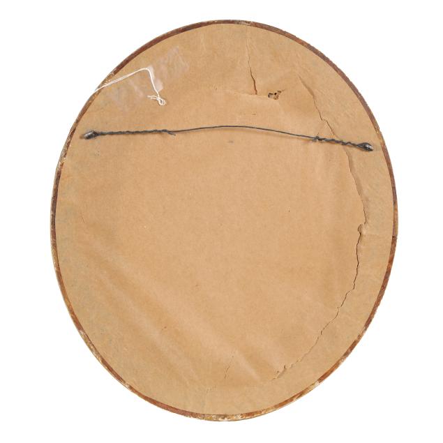Oil on canvas laid on board, unsigned, presented in an antique period gilt composition oval frame.