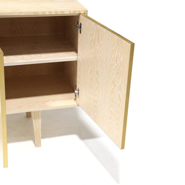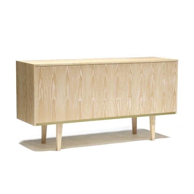 Contemporary, white washed ash case with three fabric panel doors, divided and shelved interior, tapered paneled legs, finished on all sides, labeled.
