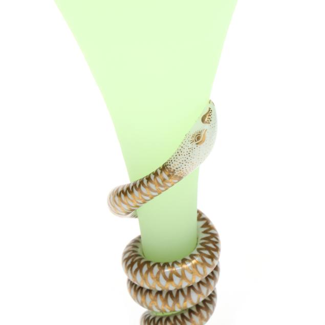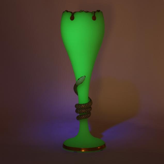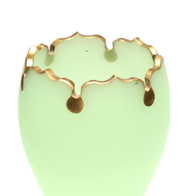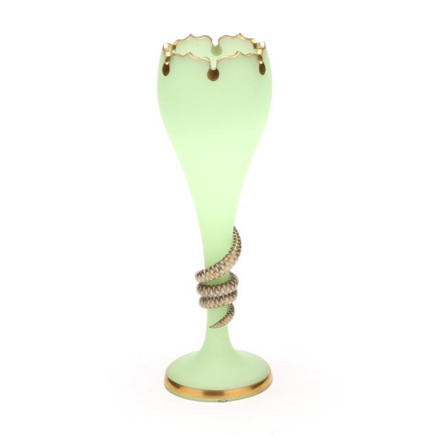 Circa 1900, satin green opaline glass with gilt highlights, applied white glass snake, unmarked.