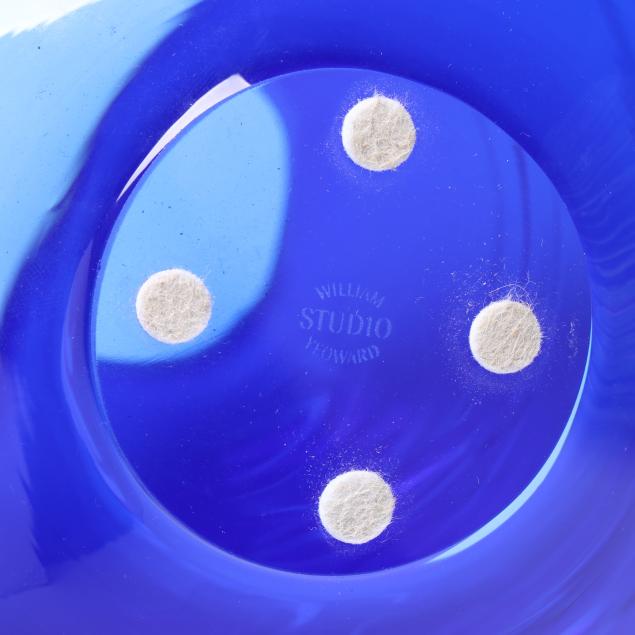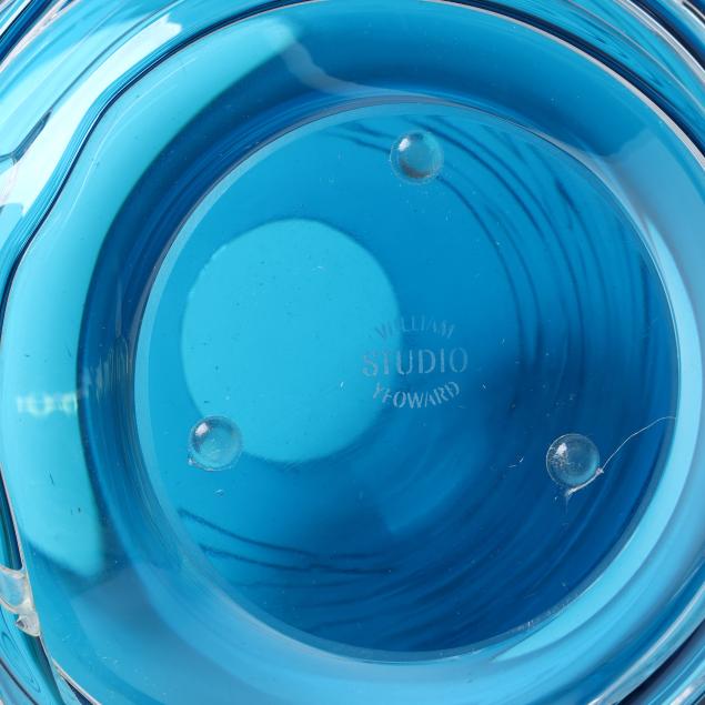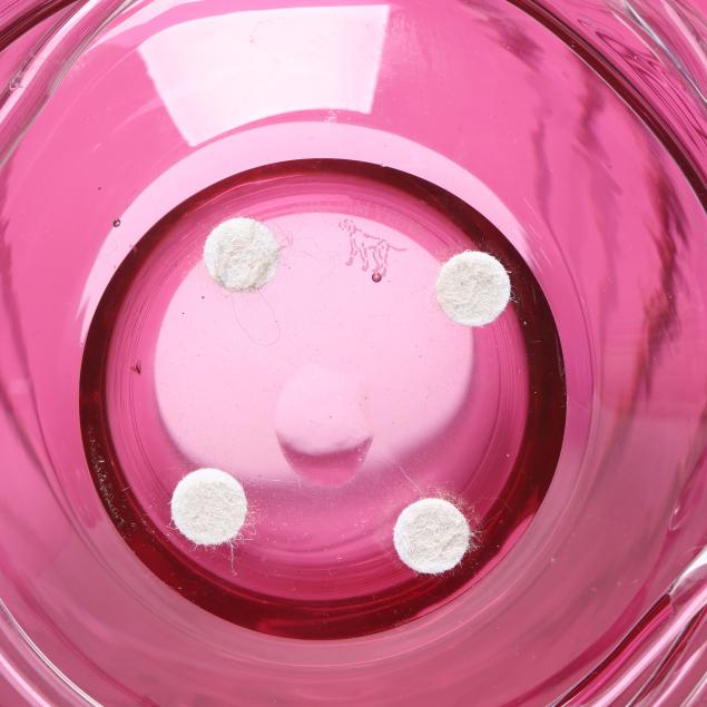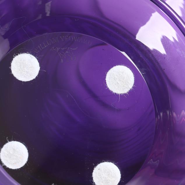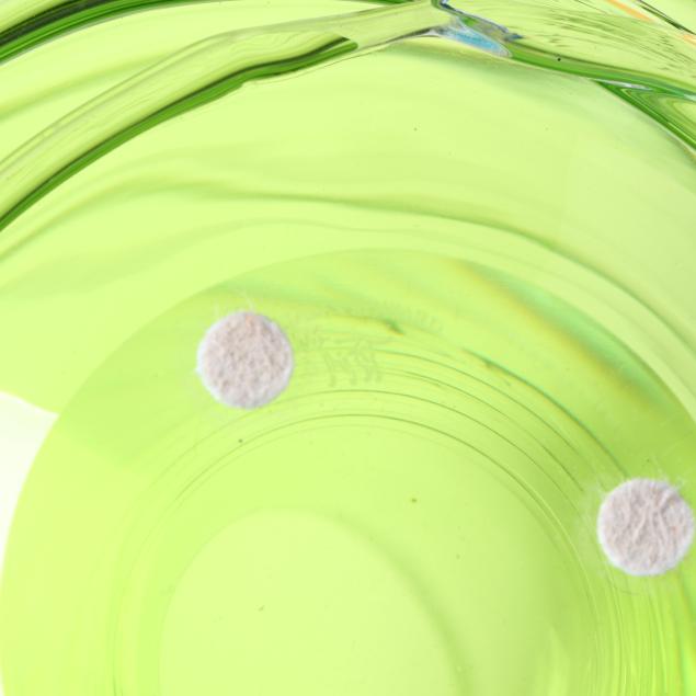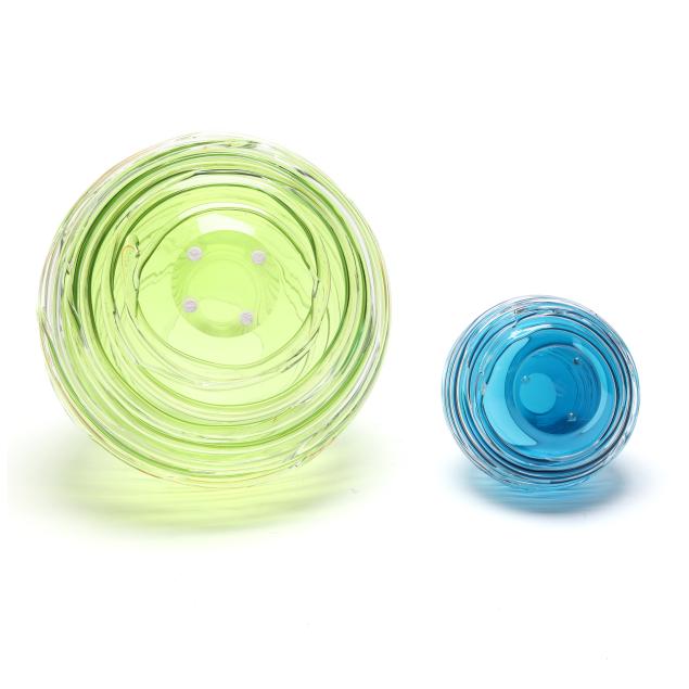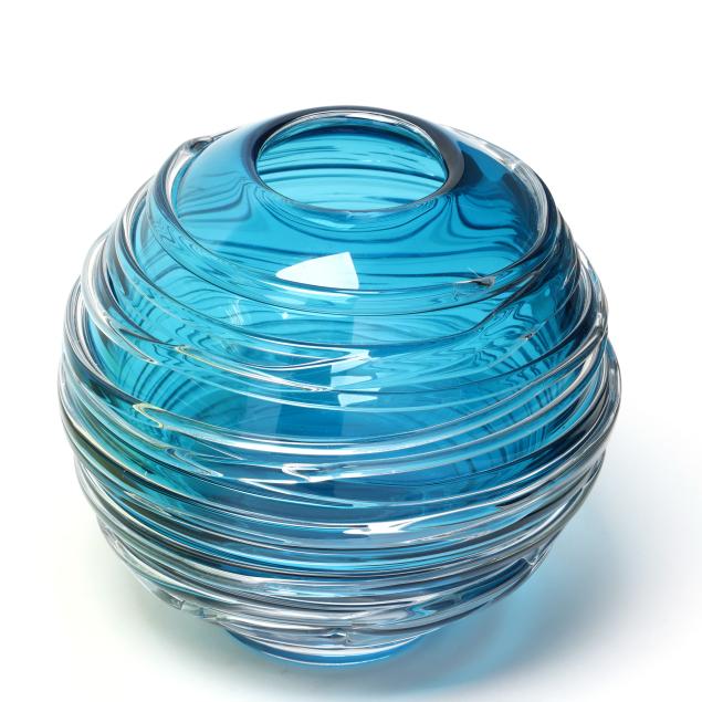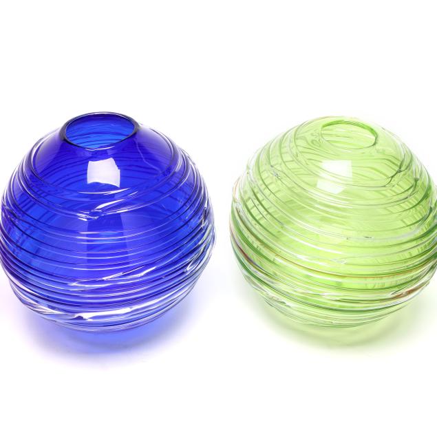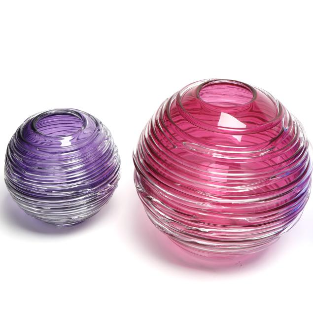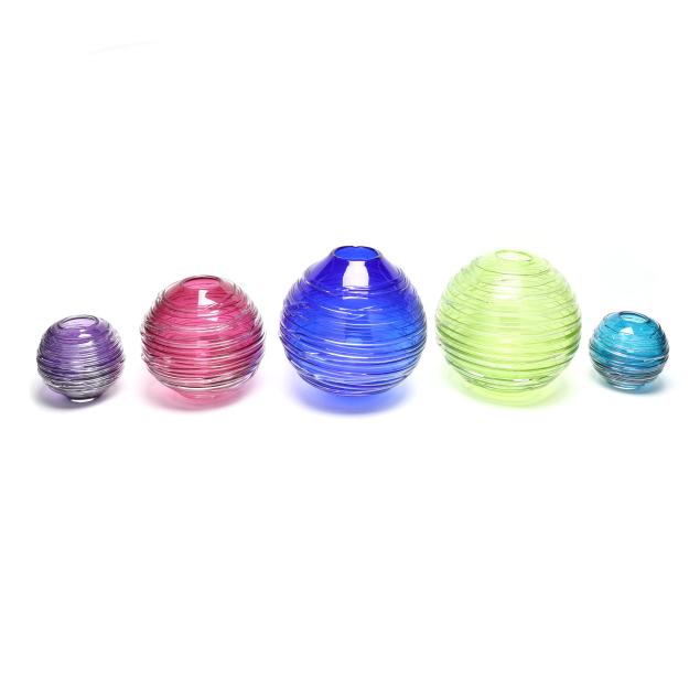Contemporary, blown glass with applied clear threading, including a large cobalt vase (11 x 9.5 in. diameter); a large vaseline colored vase (10.5 x 9.5 in. diameter); a small purple vase (6 x 5.5 in. diameter); a medium sized cranberry vase (8.5 x 8 in. diameter); and a small aqua blue vase (5.75 x 5.5 in. diameter), signed.