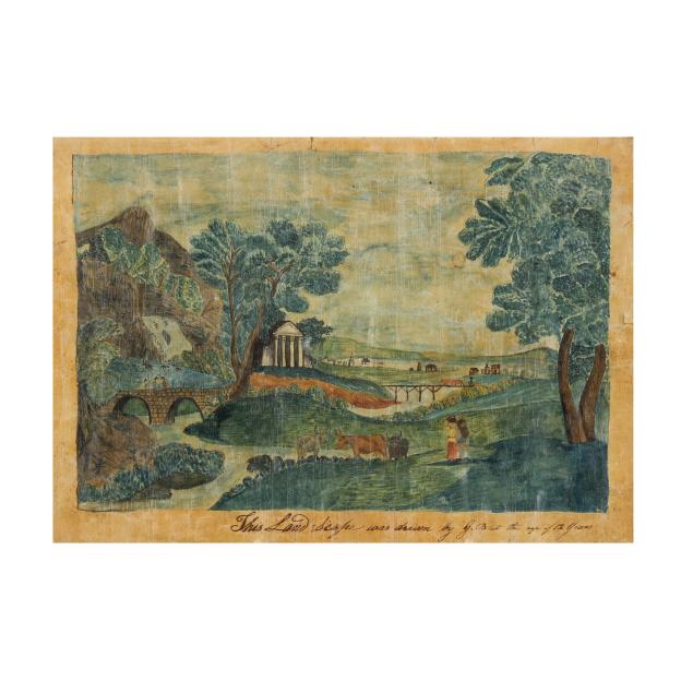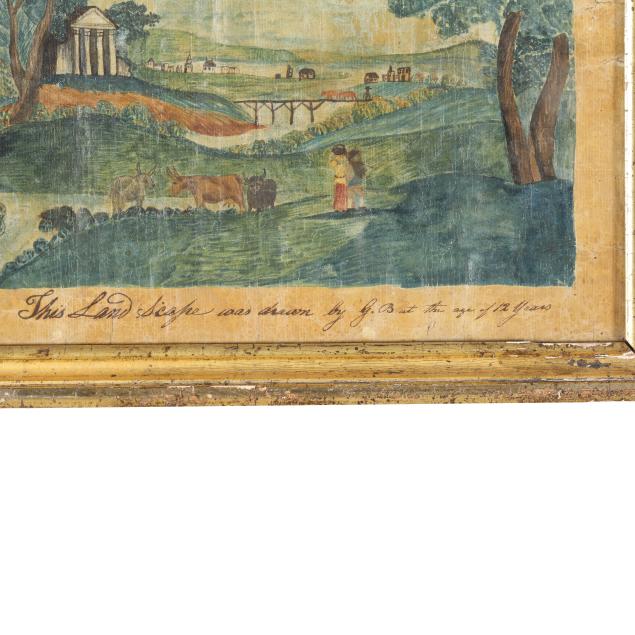 18th or early 19th century, English, watercolor on laid paper, depicting a continental landscape with figures, inscribed "This Land Scape was drawn by G. B. at the age of 12 Years," framed below glass.