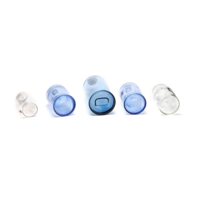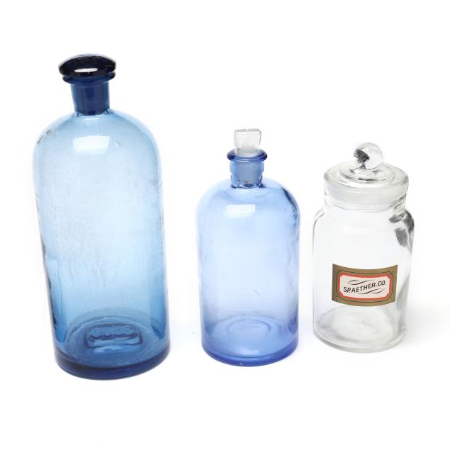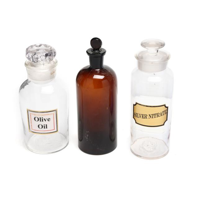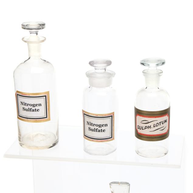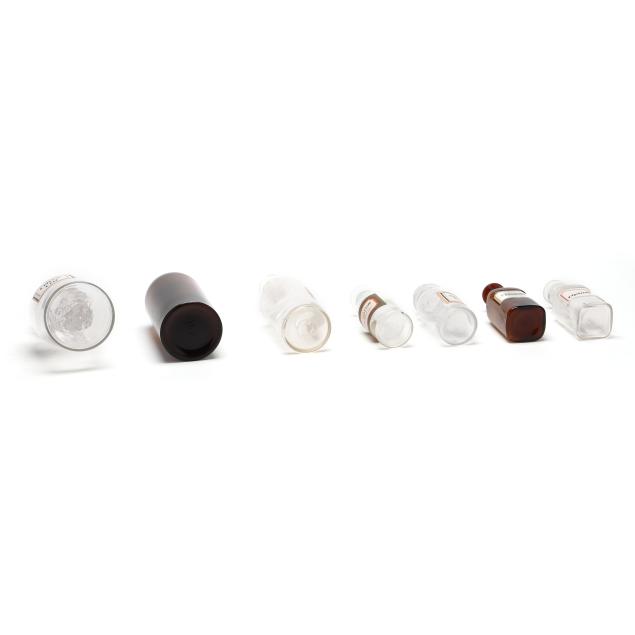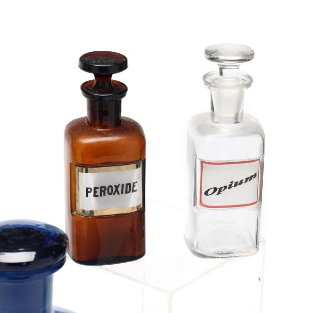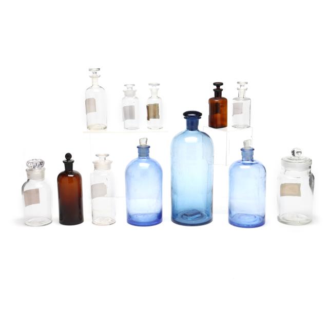 Late 19th and early 20th century, including three in light blue, two in dark amber and seven clear, eight of the bottles with labels, all bottles with stoppers and or lids.