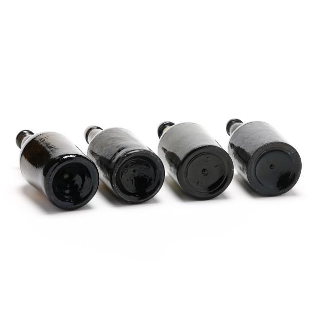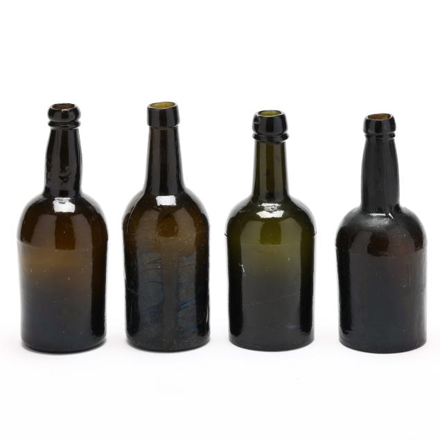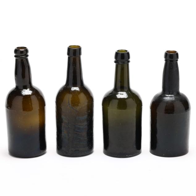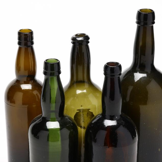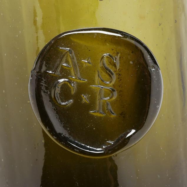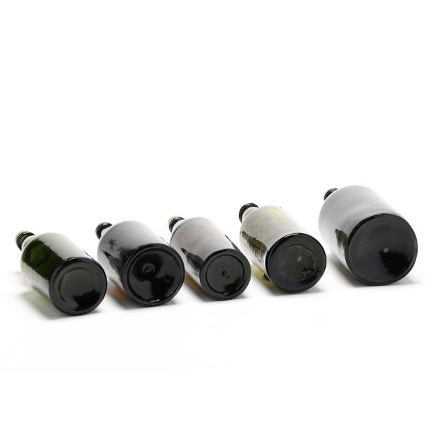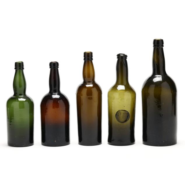 19th century, mold blown dark olive greens and rich amber browns, one bottle with pressed glass seal "A*S / C*R."