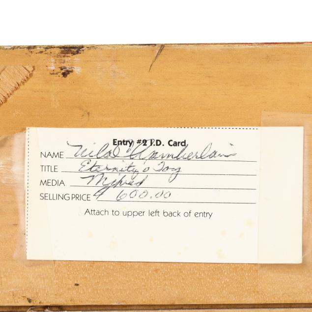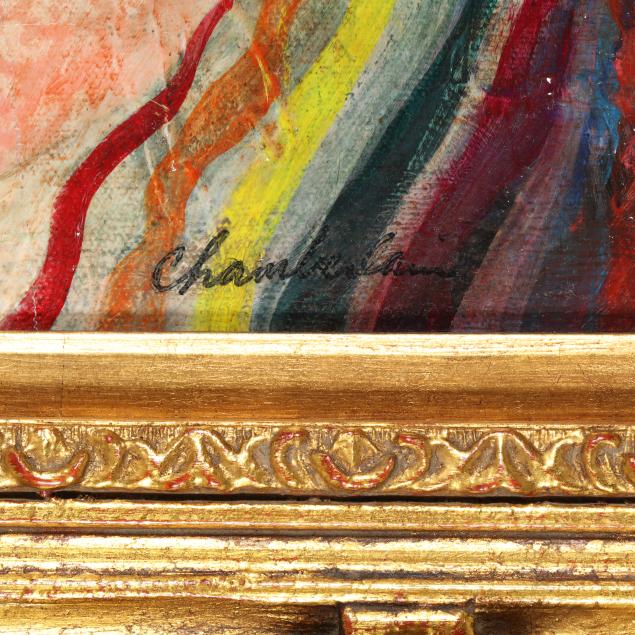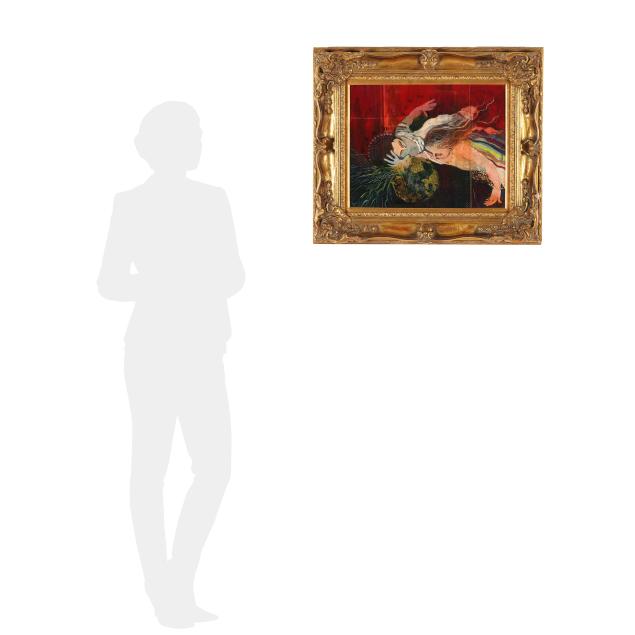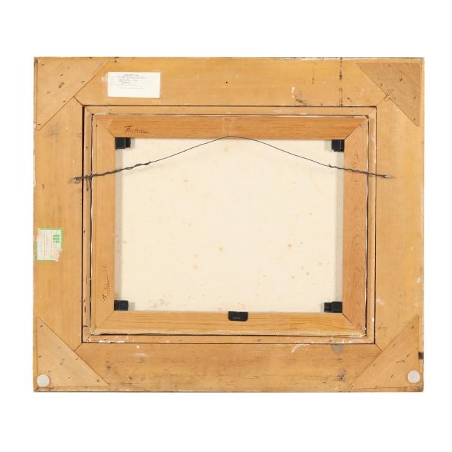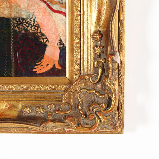 Mixed media on panel, signed at lower left edge, retaining artist label to verso, presented in an ornate gilt frame.