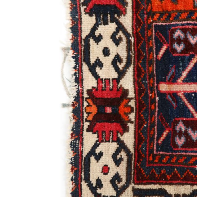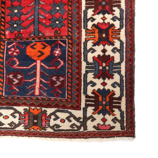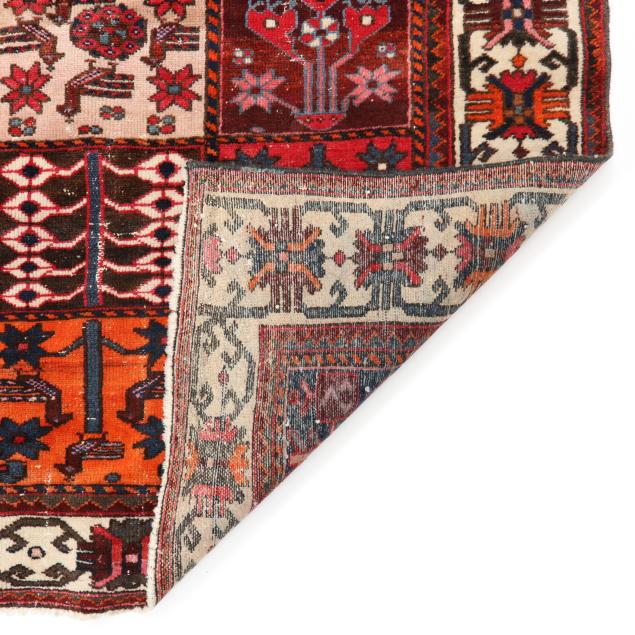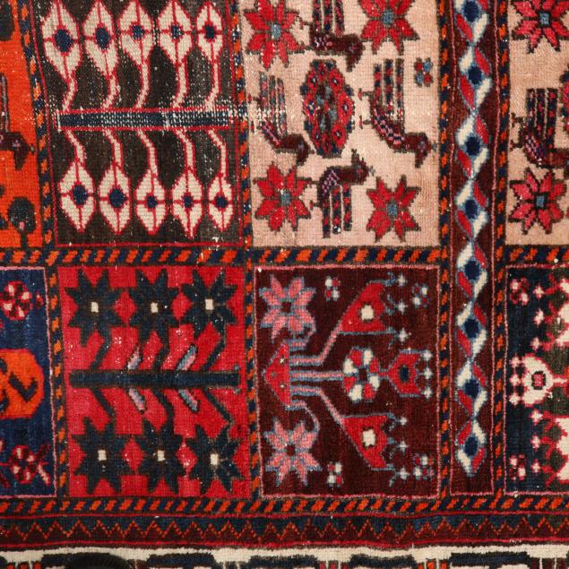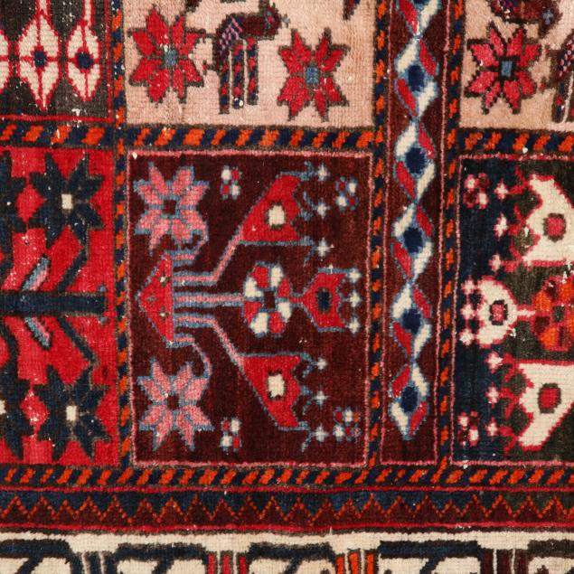 Wool on cotton foundation, the central field with floral and avian motifs in the Khesti pattern of compartments, the main cream border with repeating stylized floral motifs.