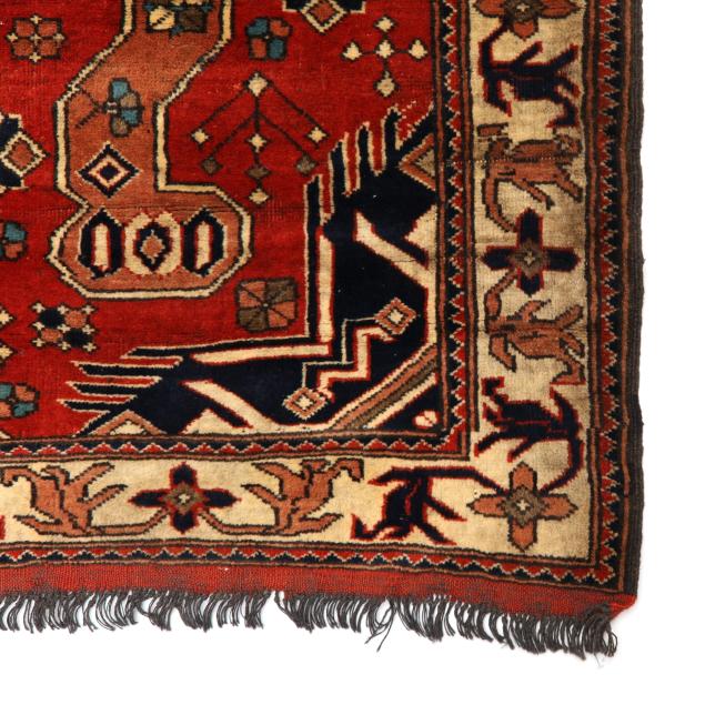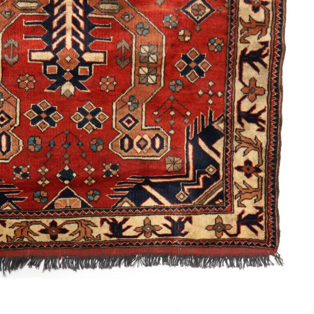 Very soft lustrous wool pile on gray wool & synthetic blend foundation, the central cross shaped midnight blue medallion on red field surrounded by geometric motifs, with spiky midnight blue spandrels, main cream border with trailing floral and foliate motifs, with red flatweave to either end.