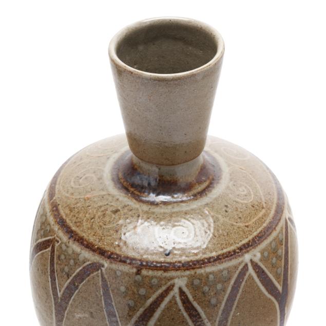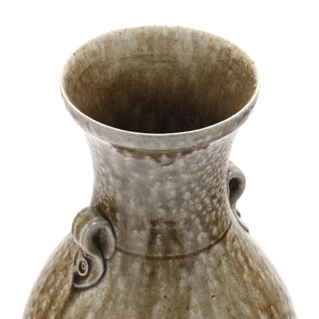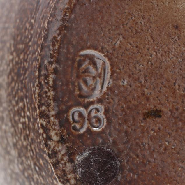 Ash and salt glazed stoneware, both stamped with 1995-present oval potter's glyph, the first of baluster form featuring applied dual lug handles, additionally stamped "96" for the 96th firing (14 x 7 x 7 in.); the second with a semi ovoid form with cup mouth, decorated in branching and spiraled white slip patterns with warm brown glazes, additionally stamped "79" for the 79th firing (14 x 7 x 7 in.).