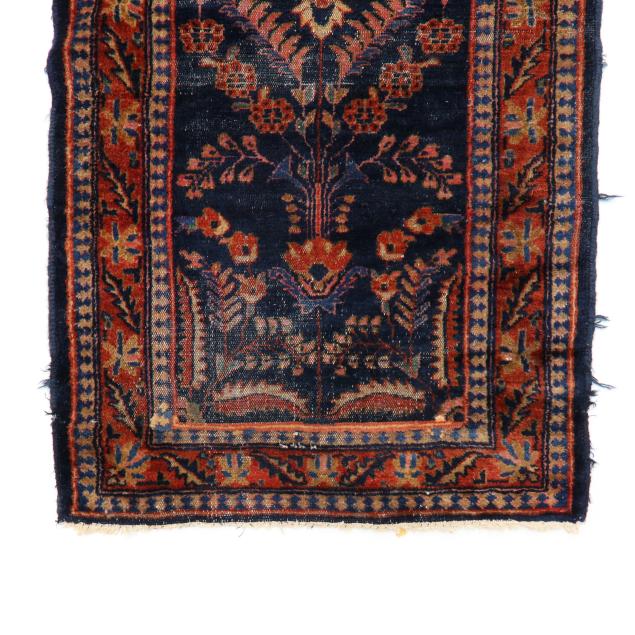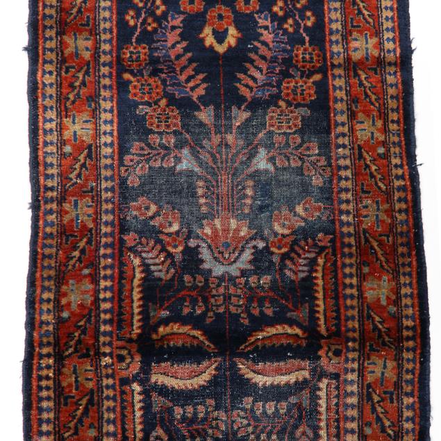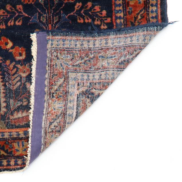 Wool on cotton foundation, the navy field with repeating floral sprays emanating from central floral medallion, the red border with repeating floral and foliate motifs, within minor reciprocal borders.