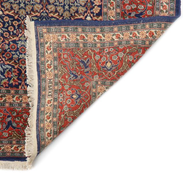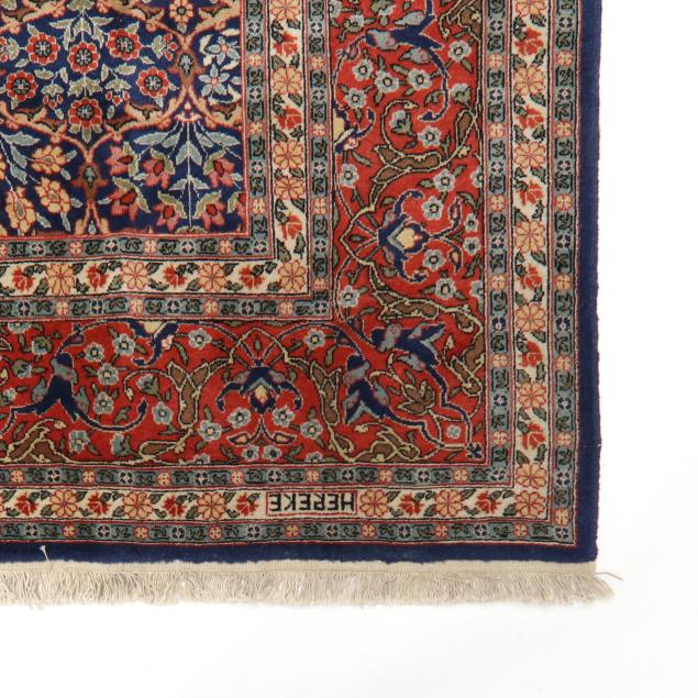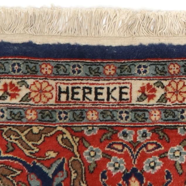 Wool on cotton foundation; the navy field with lattice of repeating floral clusters, the red border with scrolling floral motifs, within multiple minor floral borders, with the word "HEREKE" in the cream border near one corner.