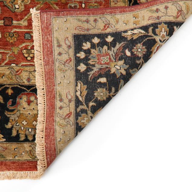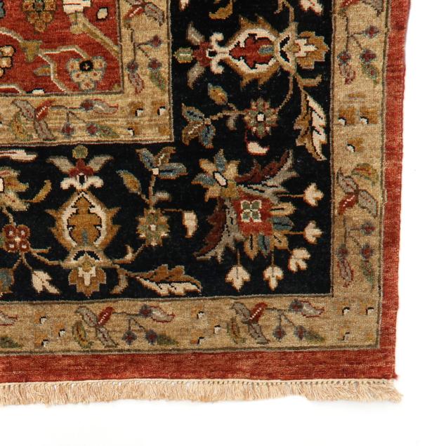 Contemporary, wool on cotton foundation, the rust field with lattice of floral motifs, the black main border with repeating scrolling palmette and foliate motifs, with minor tan foliate borders.