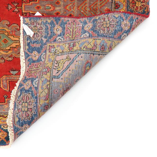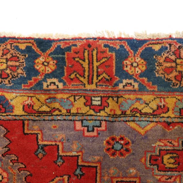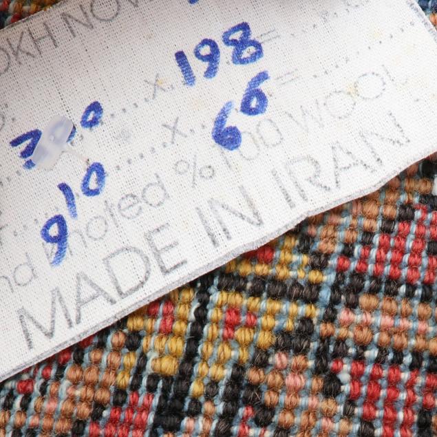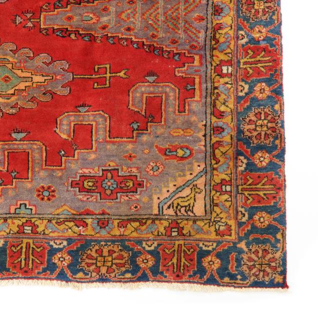 Wool on cotton foundation; the intense red field with central poled hooked medallion with green and blue foliate and floral motifs, the blue spandrels with animal motif to each corner, the main blue border with repeating red and orange palmette and floral motifs, with minor orange floral border, label to back indicates made in Iran.