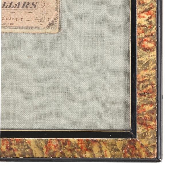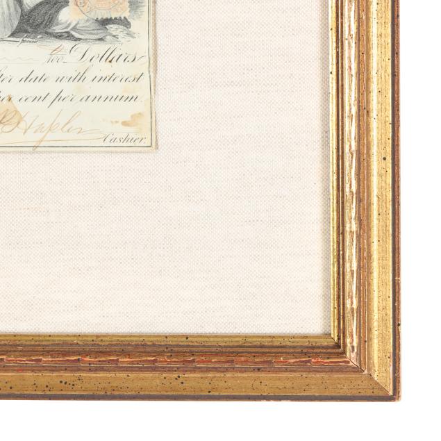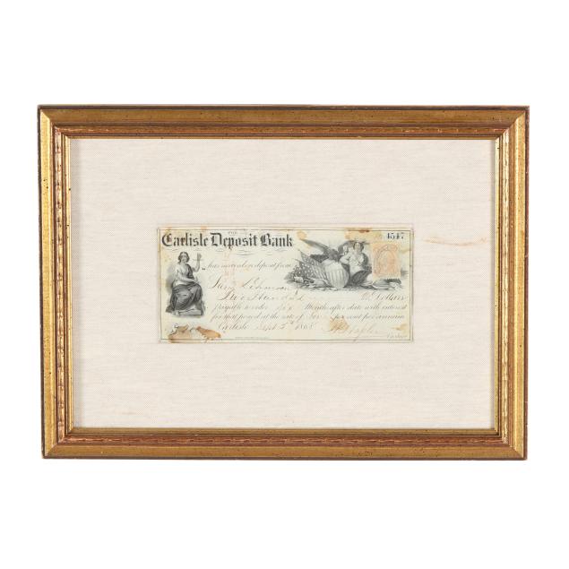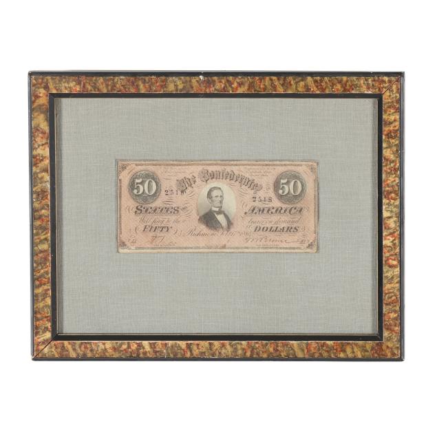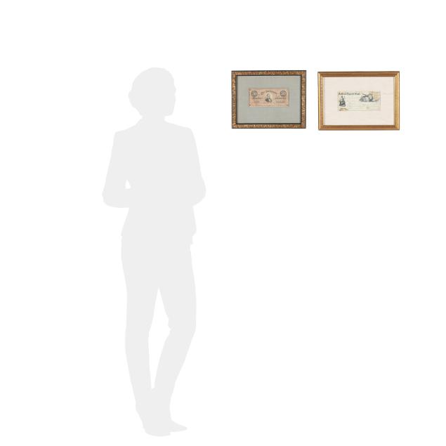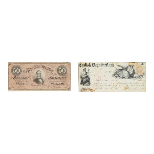 To include: Confederate $50 note dated February 17, 1864 with Jefferson Davis portrait, printed by Keatinge & Ball, Columbia, South Carolina, Fricke Type 66, presented against linen in a decorative wooden frame (13-5/8 x 10-1/2 in.) with only the obverse being shown; and a Certificate of Deposit for the Carlisle Deposit Bank, September 5, 1868, Carlisle, Pennsylvania, with engraved vignettes and a canceled U.S. Internal Revenue stamp.