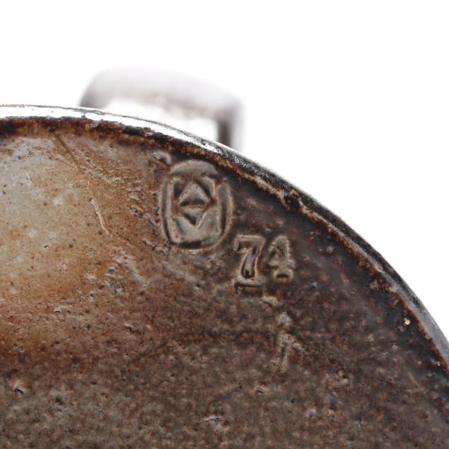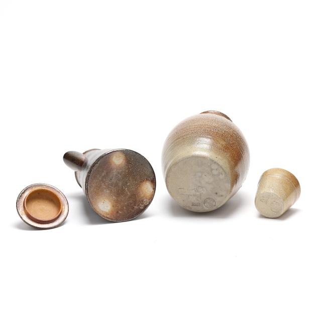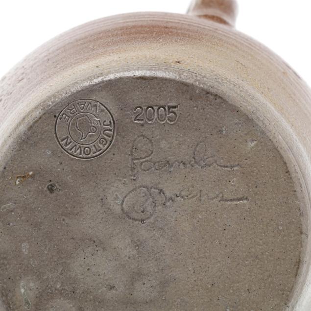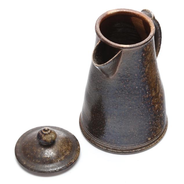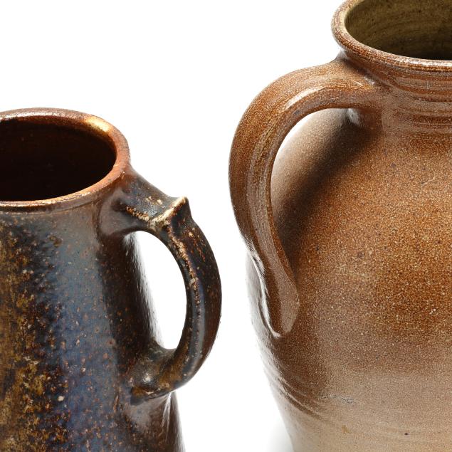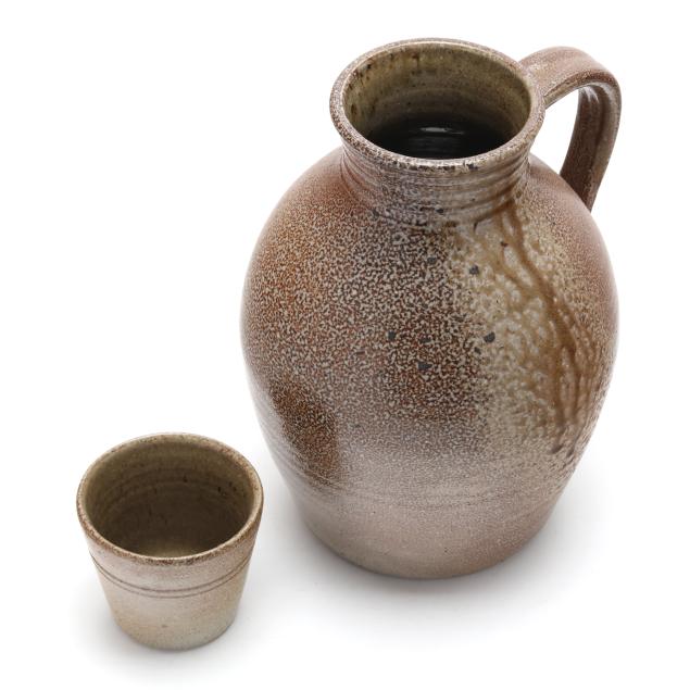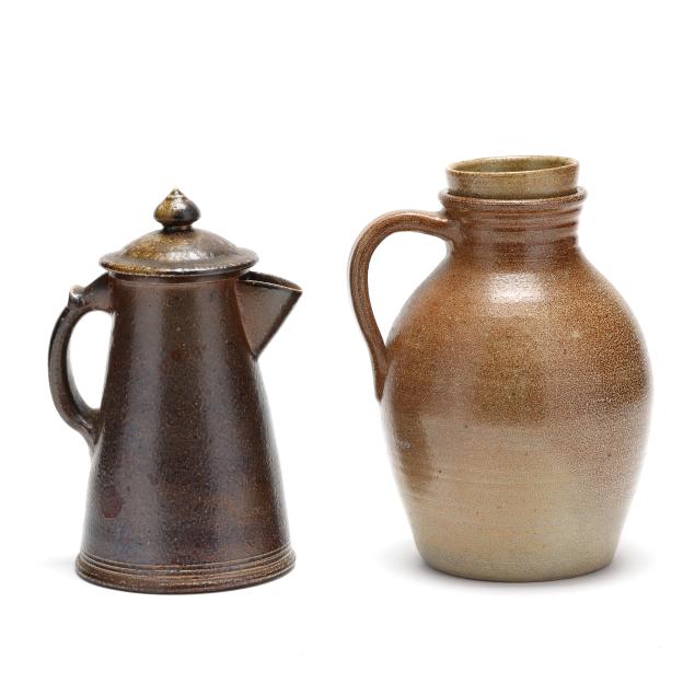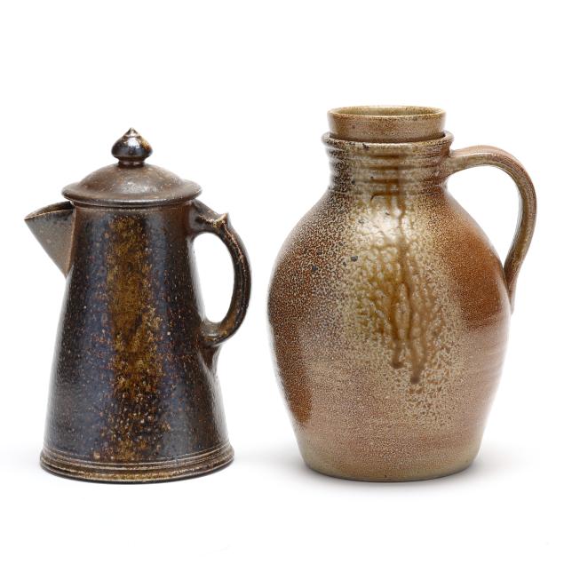 The first a dark glazed coffee pot by Mark Hewitt (NC, b. 1955), stamped with 1995-present oval potter's glyph and 74th firing stamp (9 1/4 x 6 3/4 x 5 1/4 in.); the second a semi ovoid wide mouth jug/pitcher with conforming cup, both signed by Pamela Owens with 2005 Jugtown stamp (10 x 9 x 6 in.).
