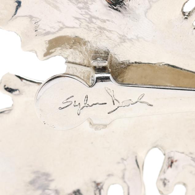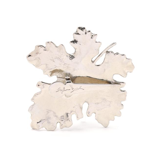 The silver-tone brooch in the form of a maple leaf, set to the center with a brass butterfly, completed with a hinged clip, signed, XRF testing brass.
