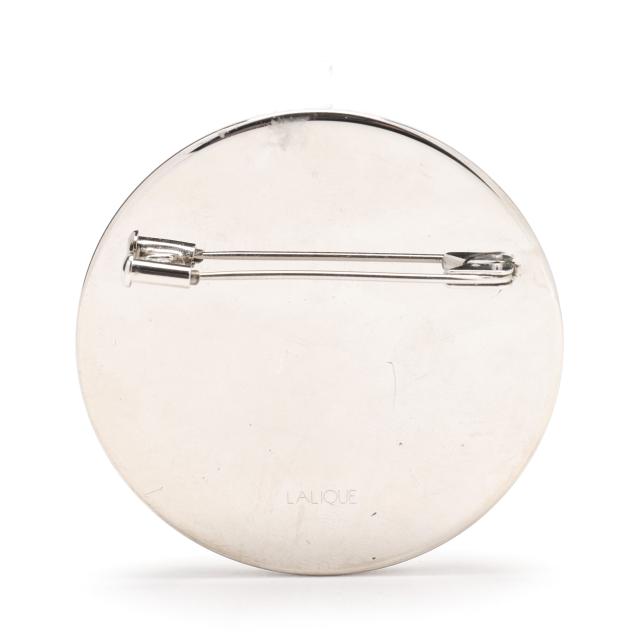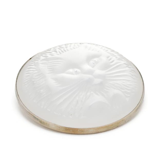 The silver-tone circle brooch set with a carved crystal portrait of a cat, completed with a locking pin stem, signed.