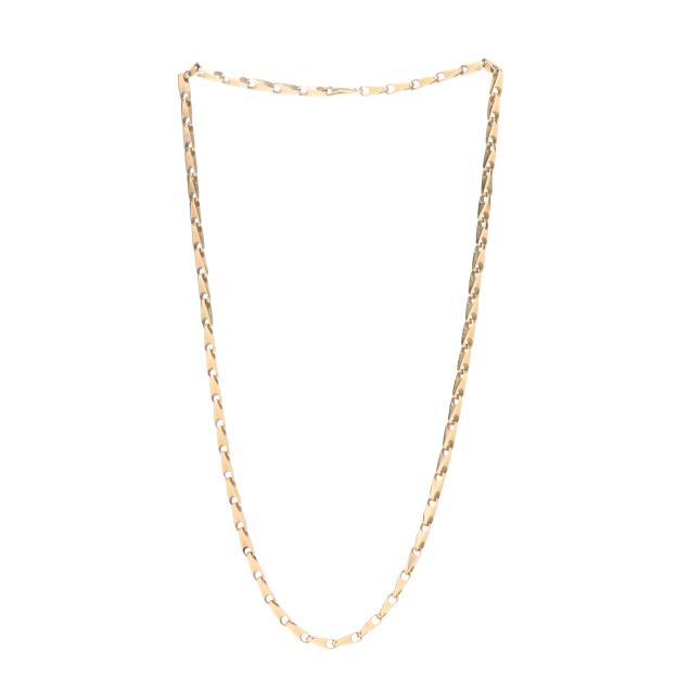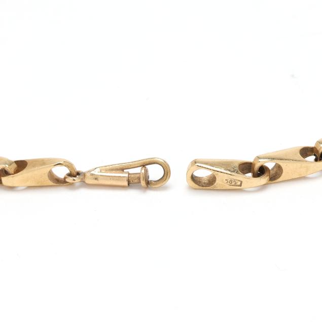The gold fancy link necklace completed with a lobster clasp, stamped with a maker's mark and 585.
