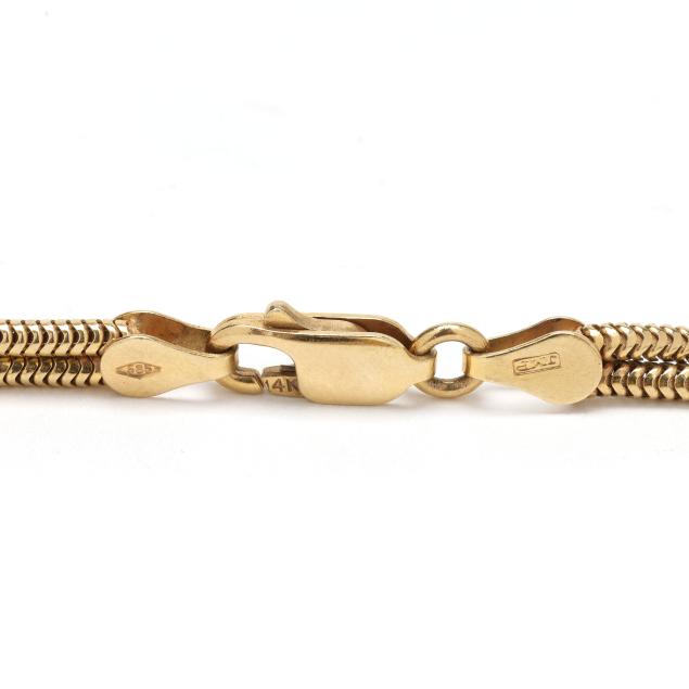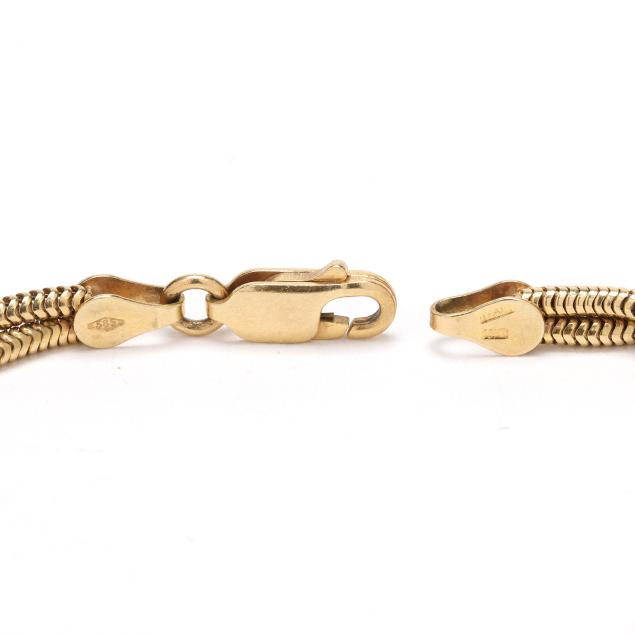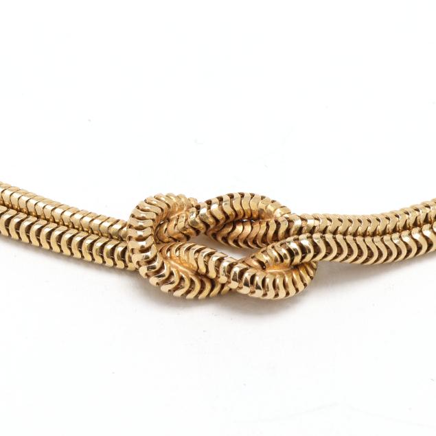 The gold double snake chain bracelet with square knot to center, completed with a lobster clasp, stamped with a partial mark and 585 / Italy / JMP.